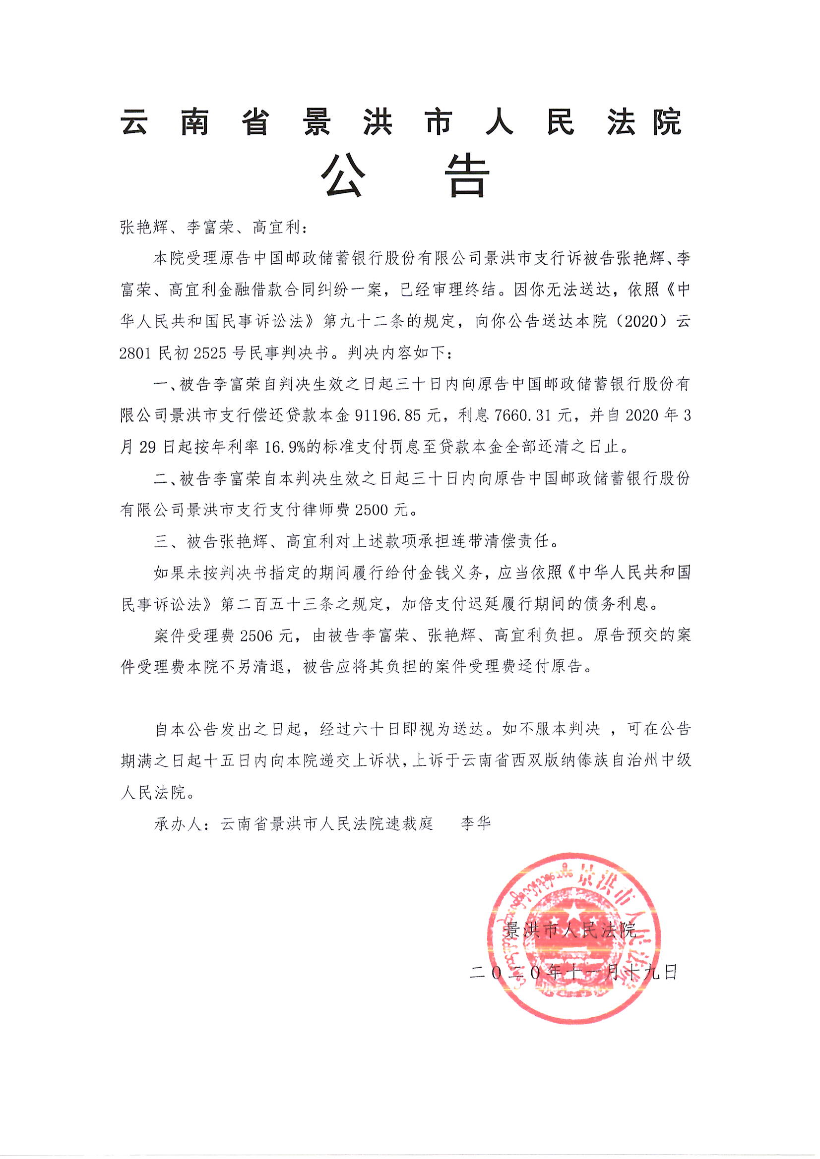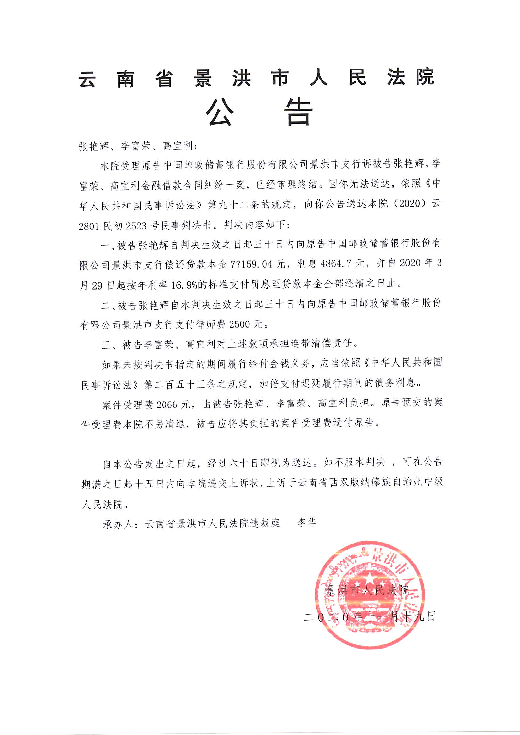 张艳辉、李富荣、高宜利(公告判决*2)