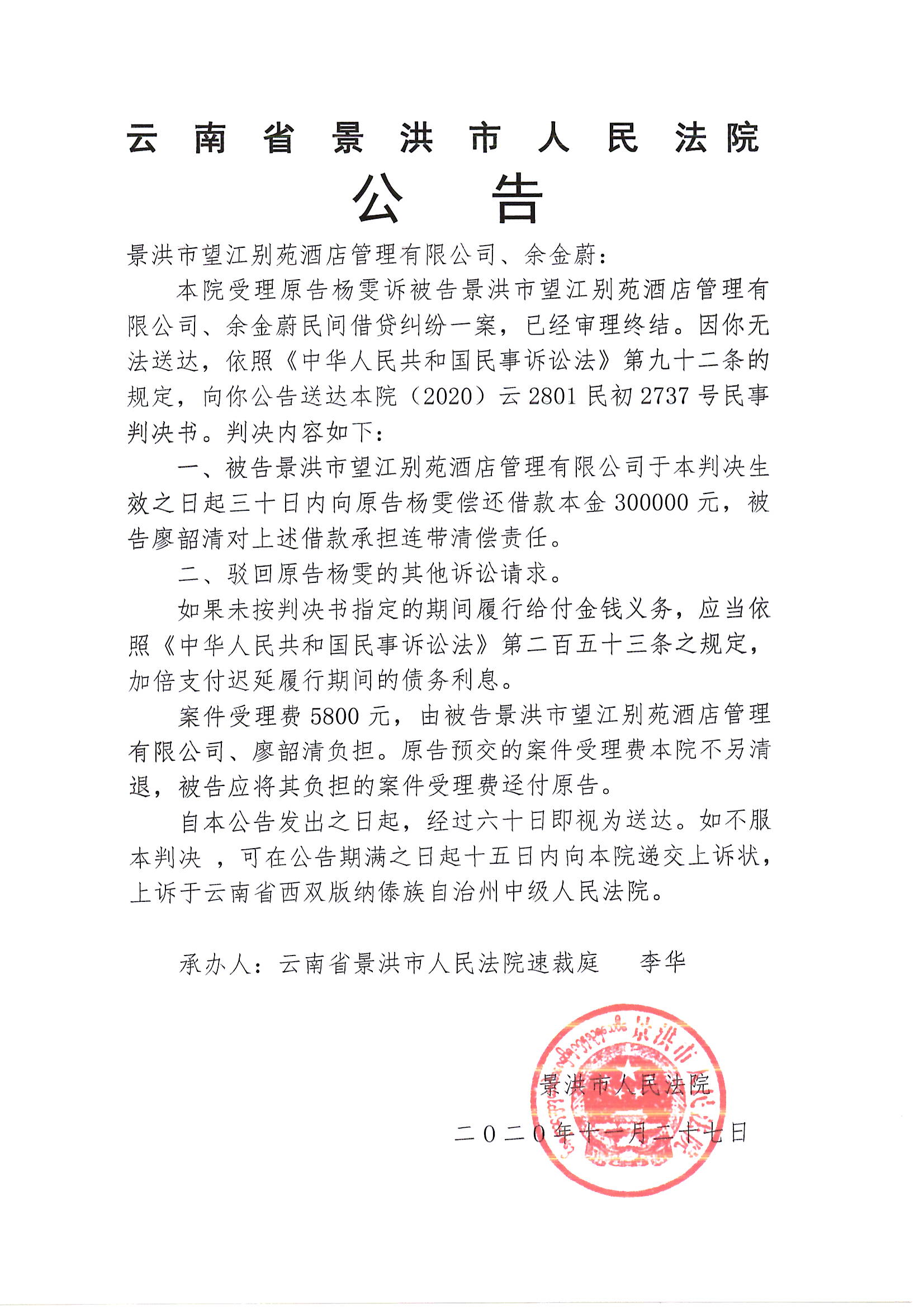 景洪市望江别苑酒店管理有限公司、余金蔚(判决公告)