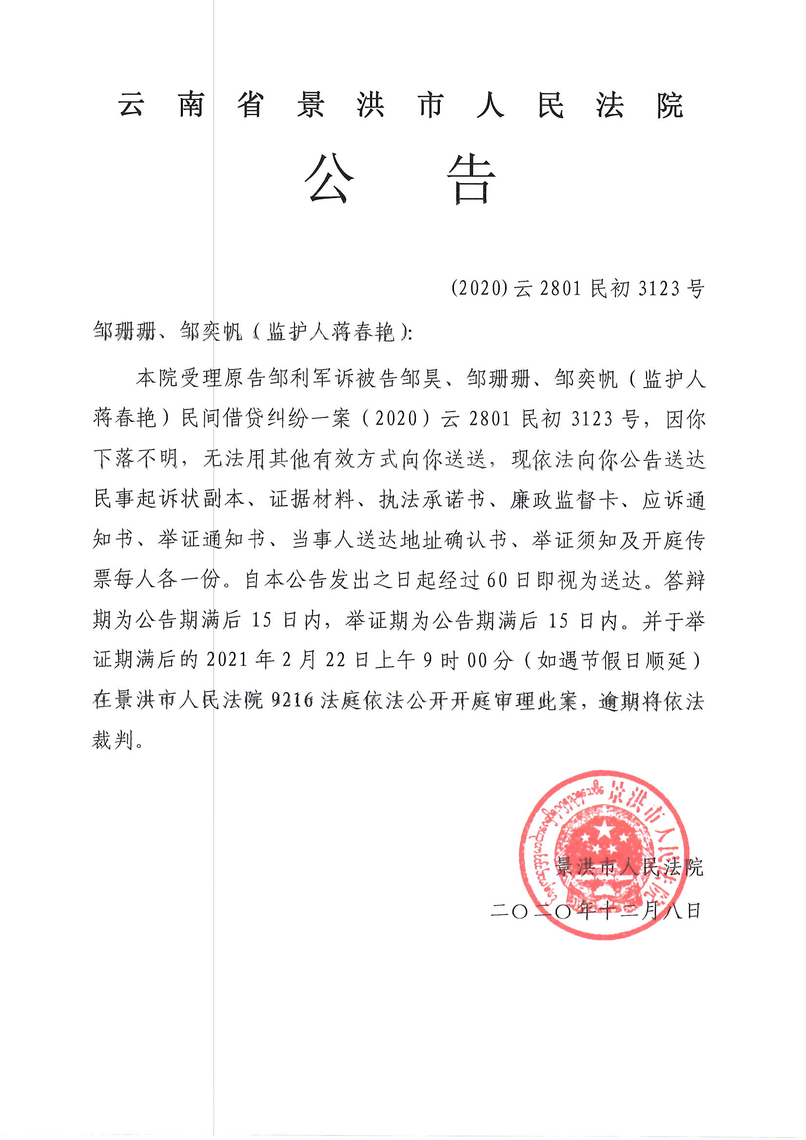 邹珊珊、邹奕帆(监护人蒋春艳)(开庭公告)