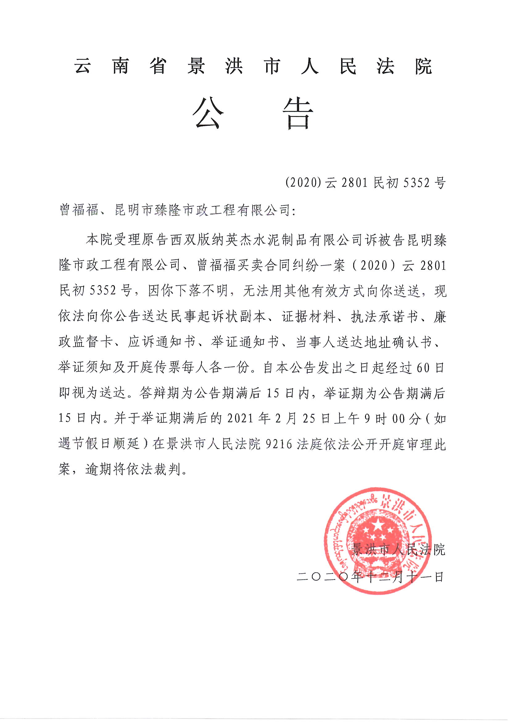 曾福福、昆明市臻隆市政工程有限公司(开庭公告)