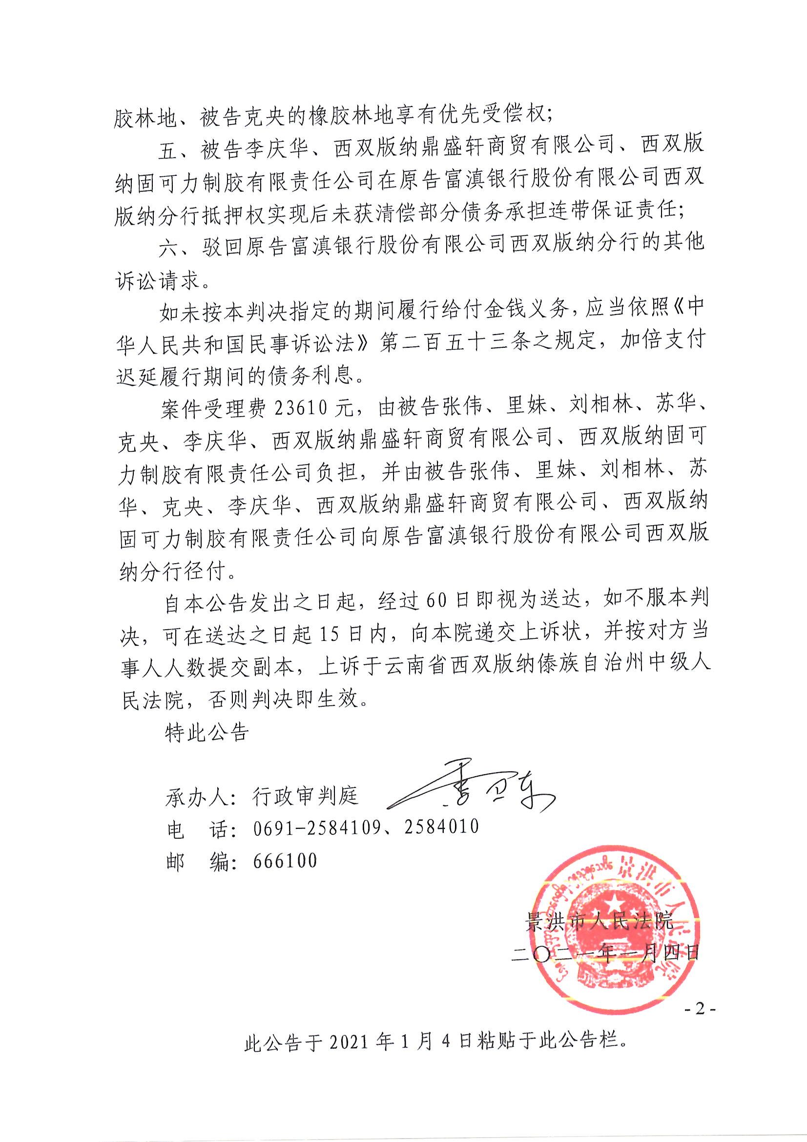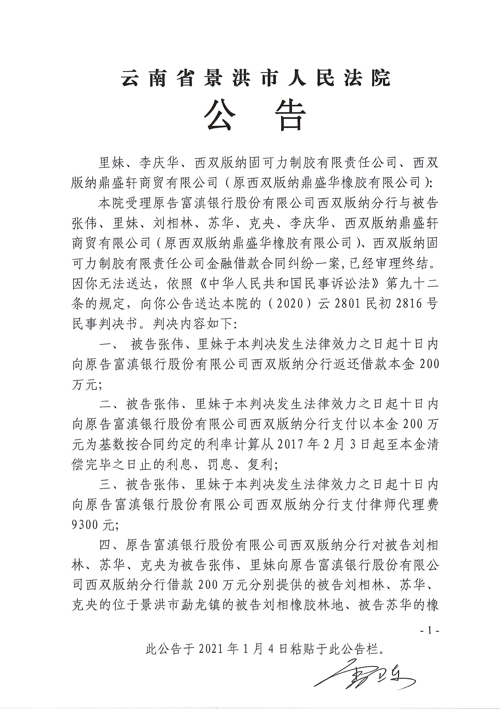 里妹、李庆华、西双版纳固可力制胶有限责任公司、西双版纳鼎盛轩商贸有限公司判决公告