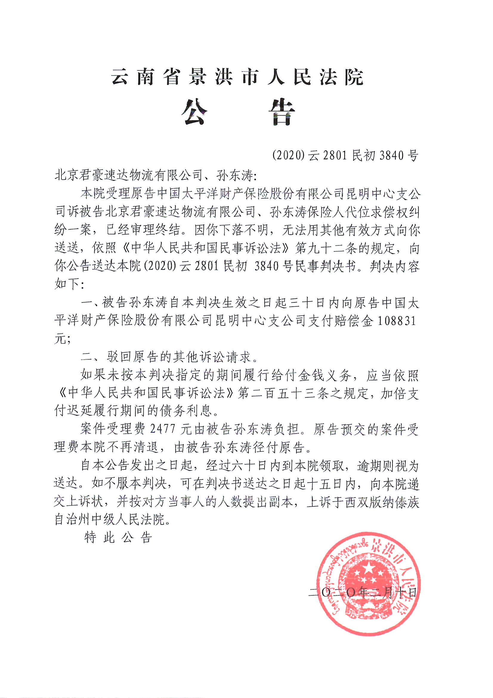 北京君豪速达物流有限公司、孙东涛(判决公告)