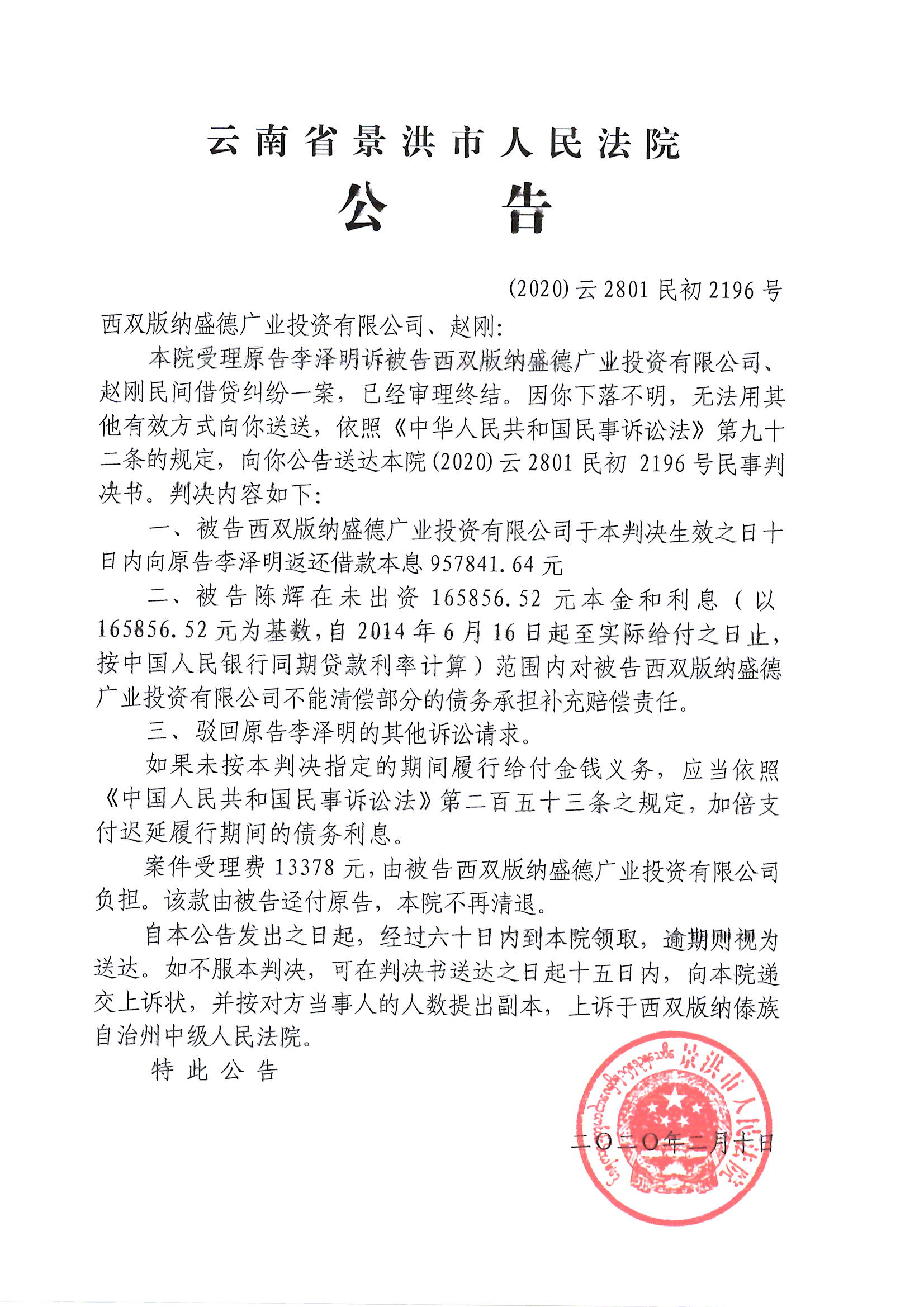 西双版纳盛德广业投资有限公司、赵刚(判决公告)