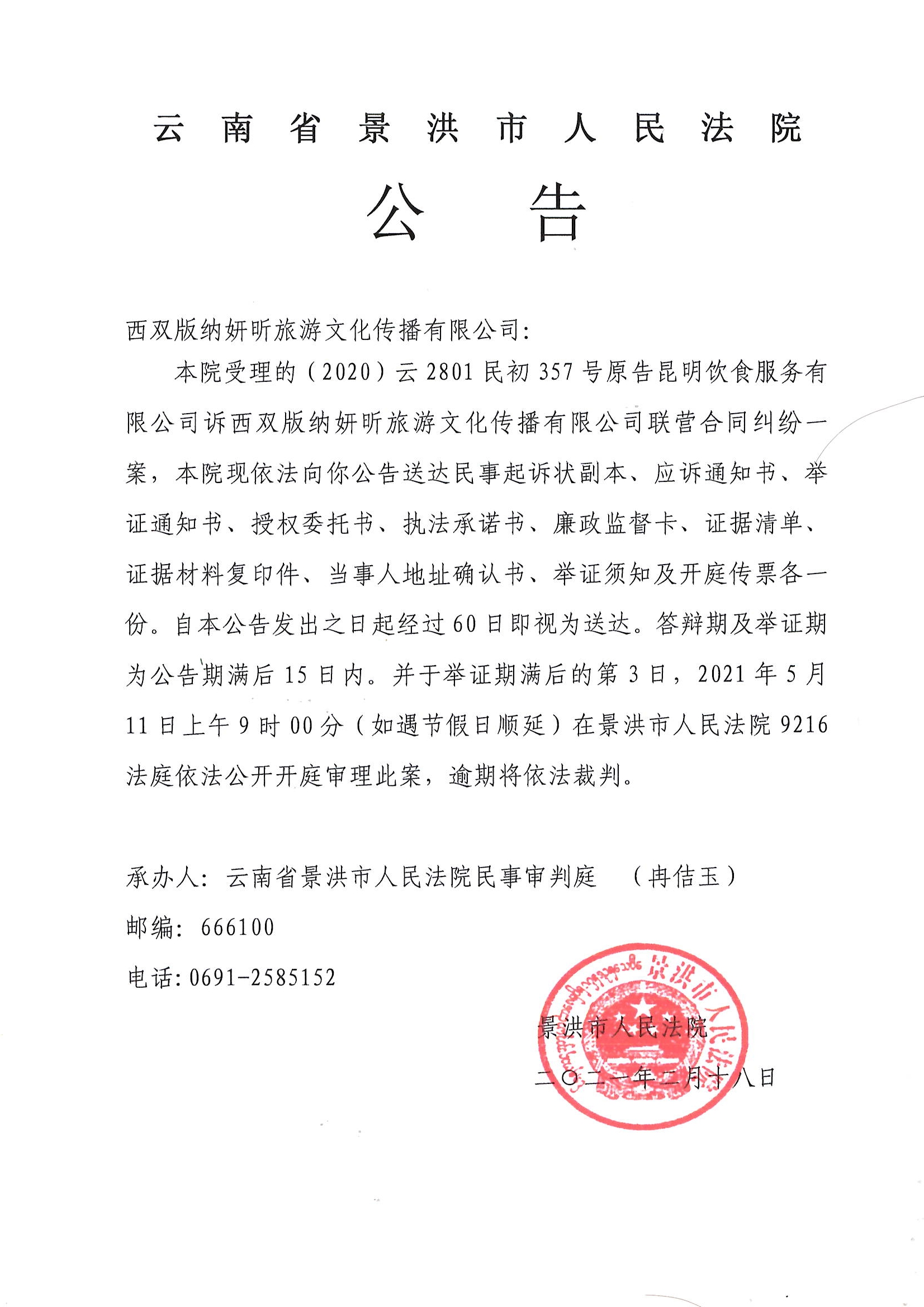 西双版纳妍昕旅游文化传播有限公司公告传票