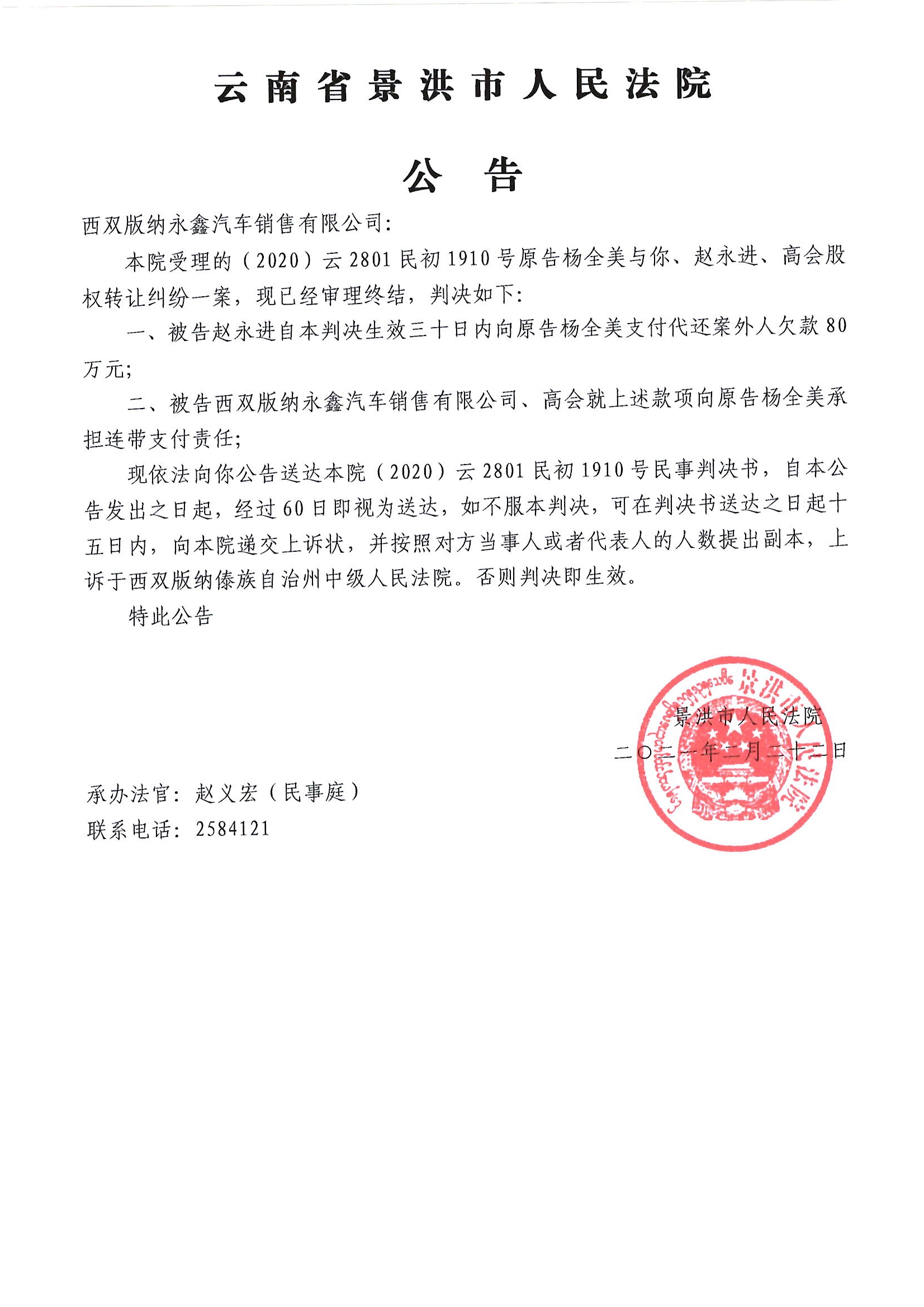 西双版纳永鑫汽车销售有限公司1910判决公告
