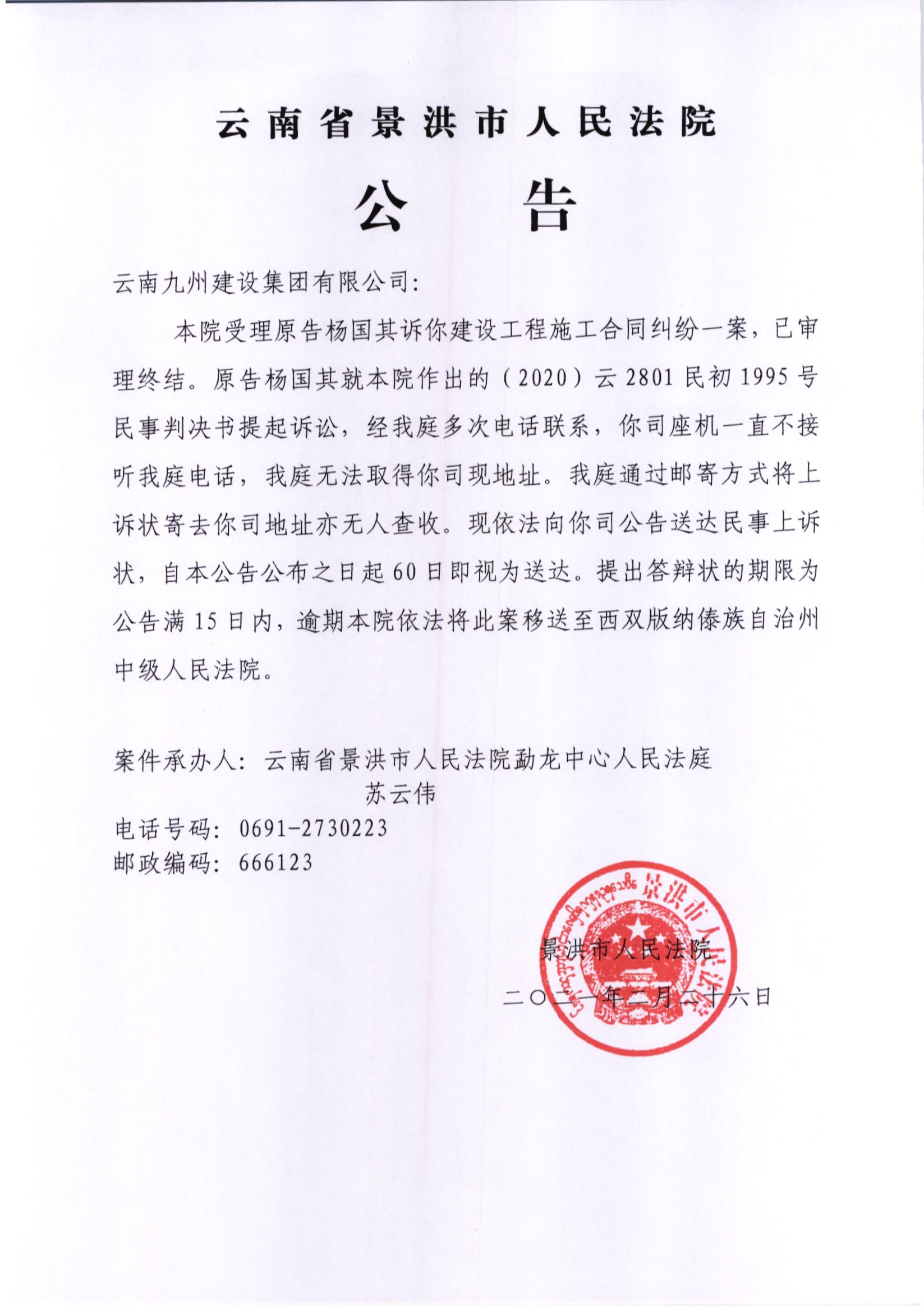 云南九州建设集团有限公司(上诉公告)
