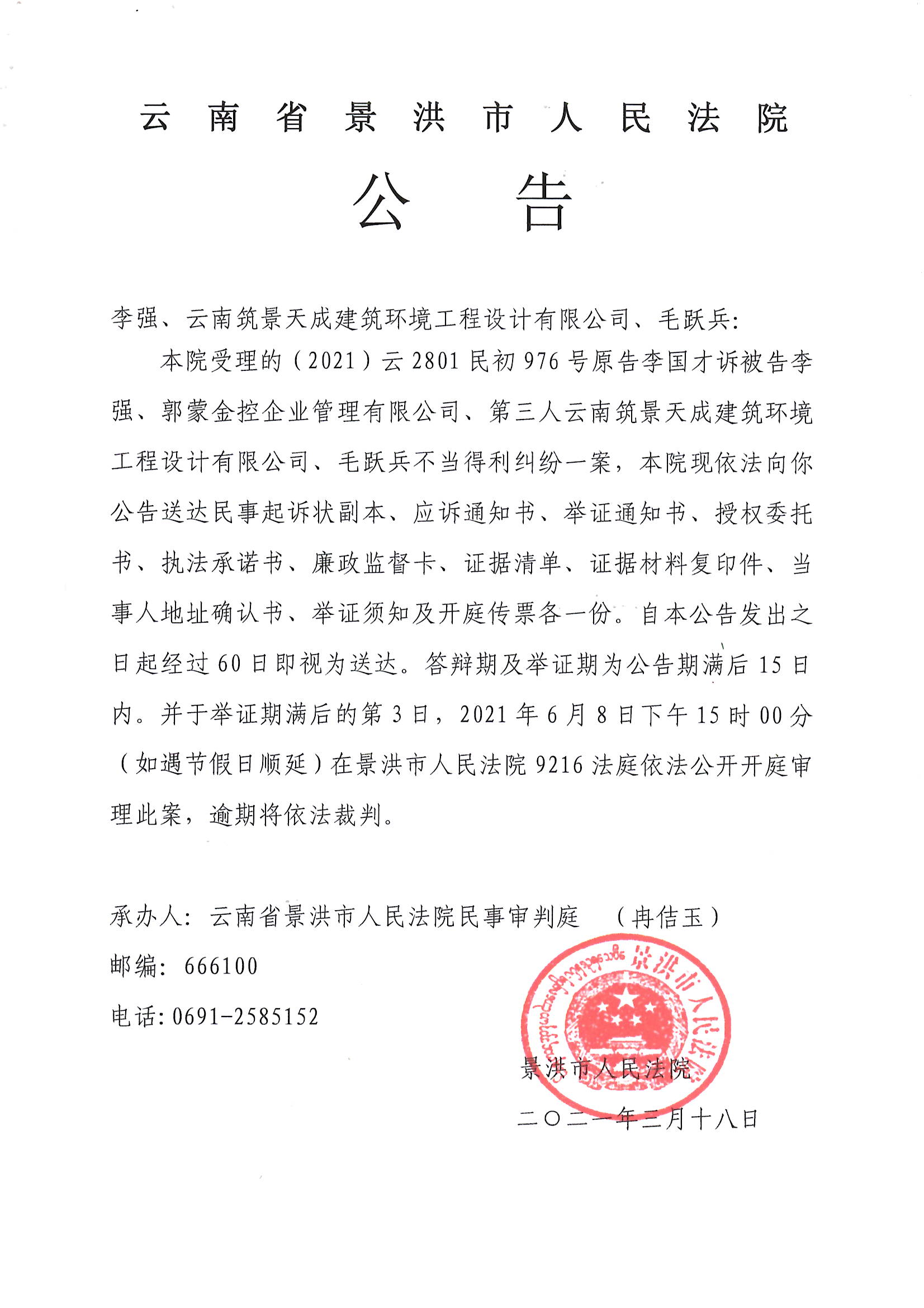 李强、云南筑景天成建筑环境工程设计有限公司、毛跃兵公告