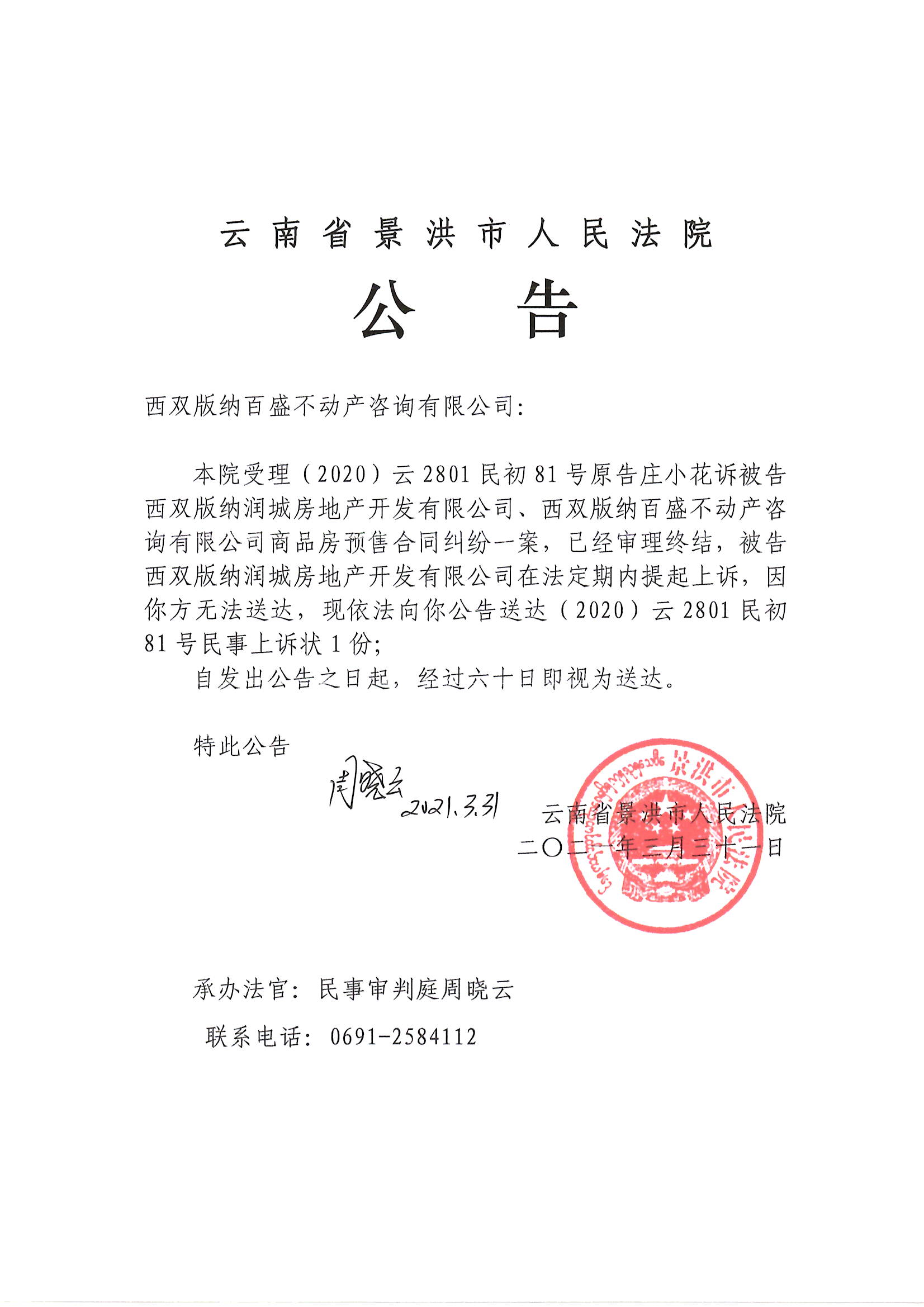西双版纳百盛不动产咨询有限公司(2020)云2801民初81号上诉公告