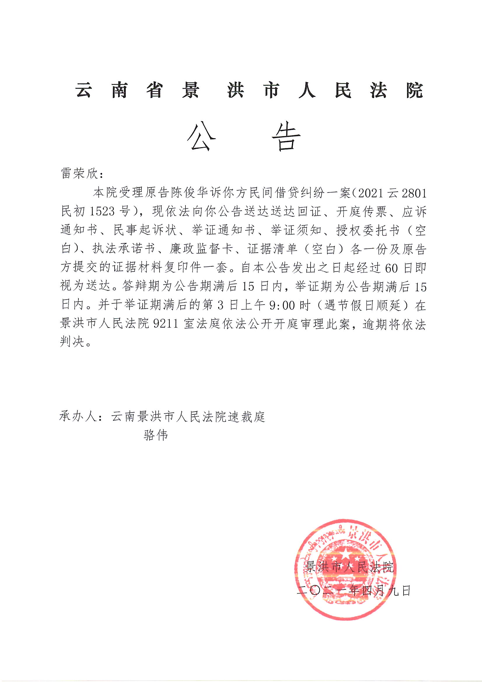 雷荣欣(传票公告)