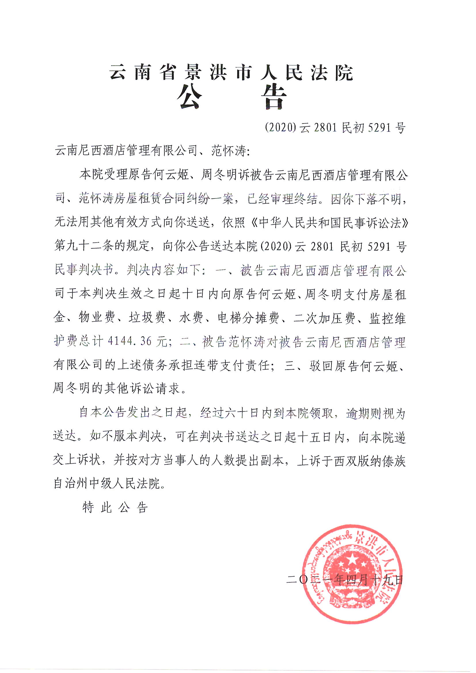 云南尼西酒店管理有限公司,范怀涛(判决公告)