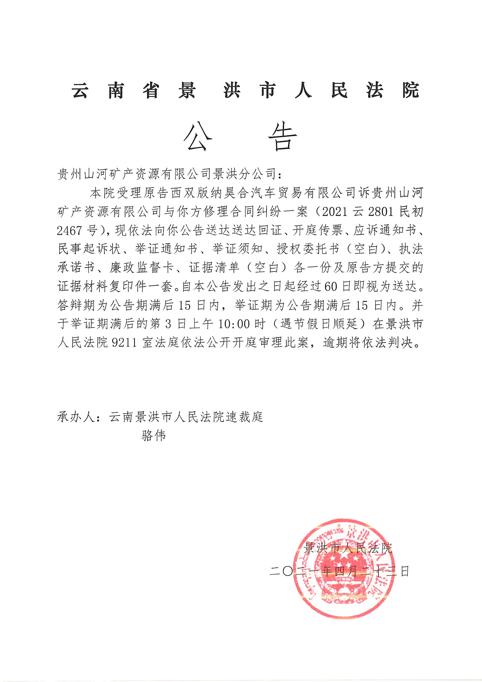 贵州山河矿产资源有限公司景洪分公司(传票公告)