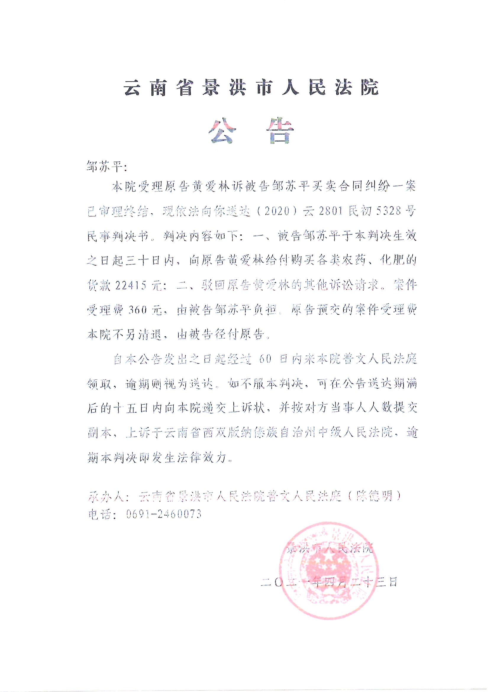 邹苏平判决公告5328号