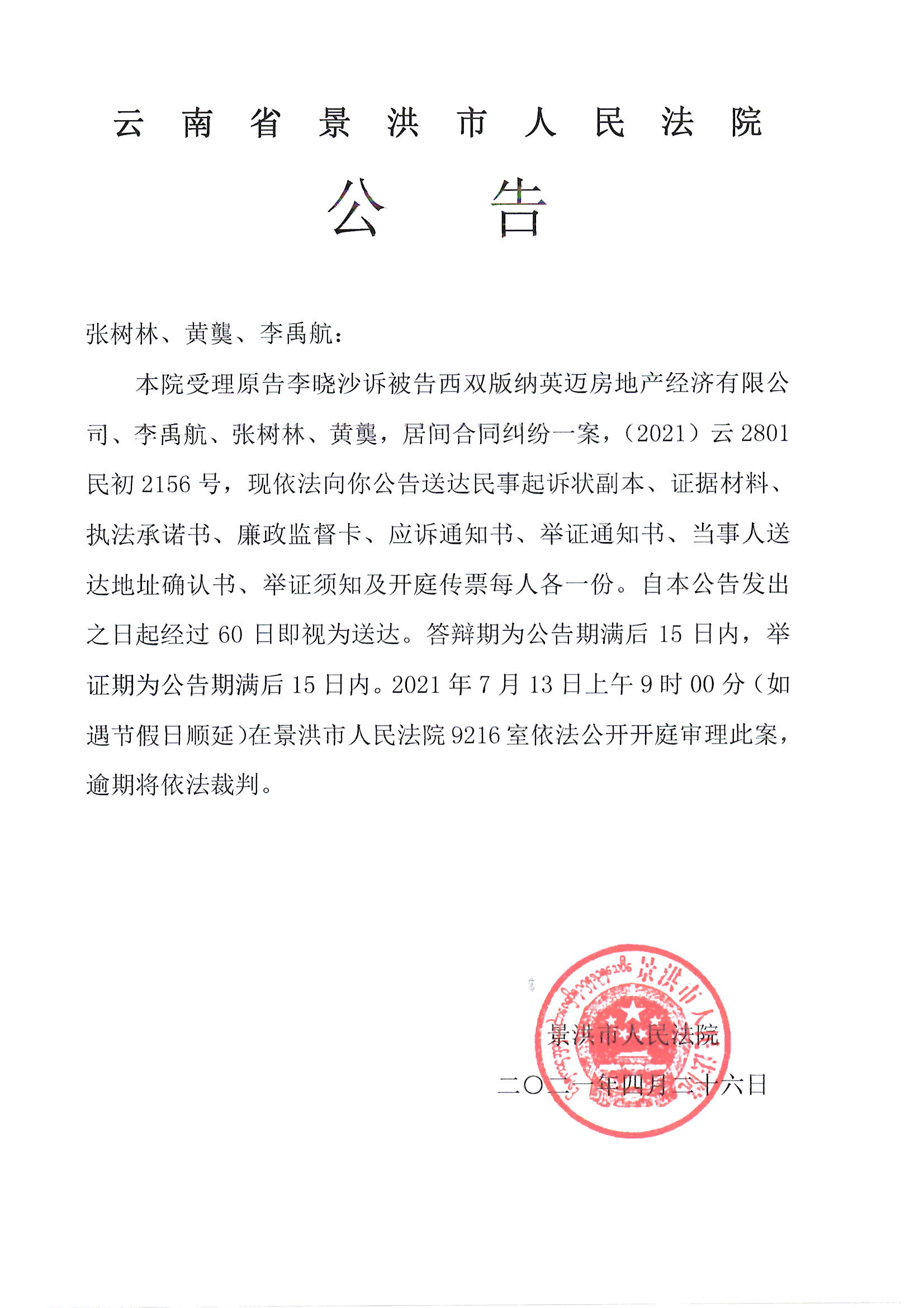 张树林、黄龑、李禹航(开庭公告)