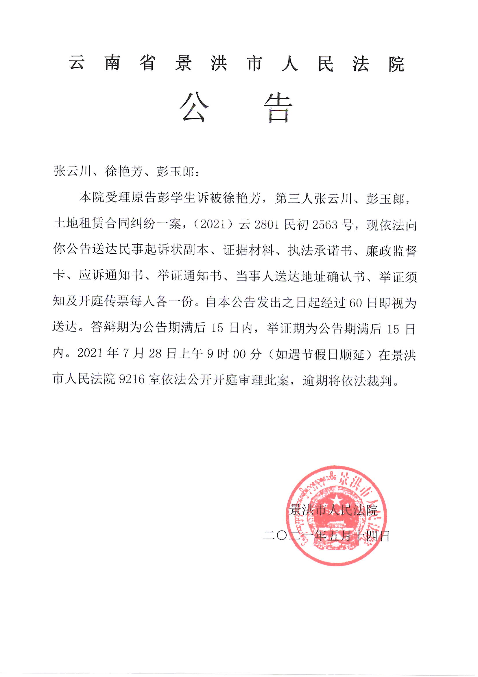 张云川、徐艳芳、彭玉郎(开庭公告)