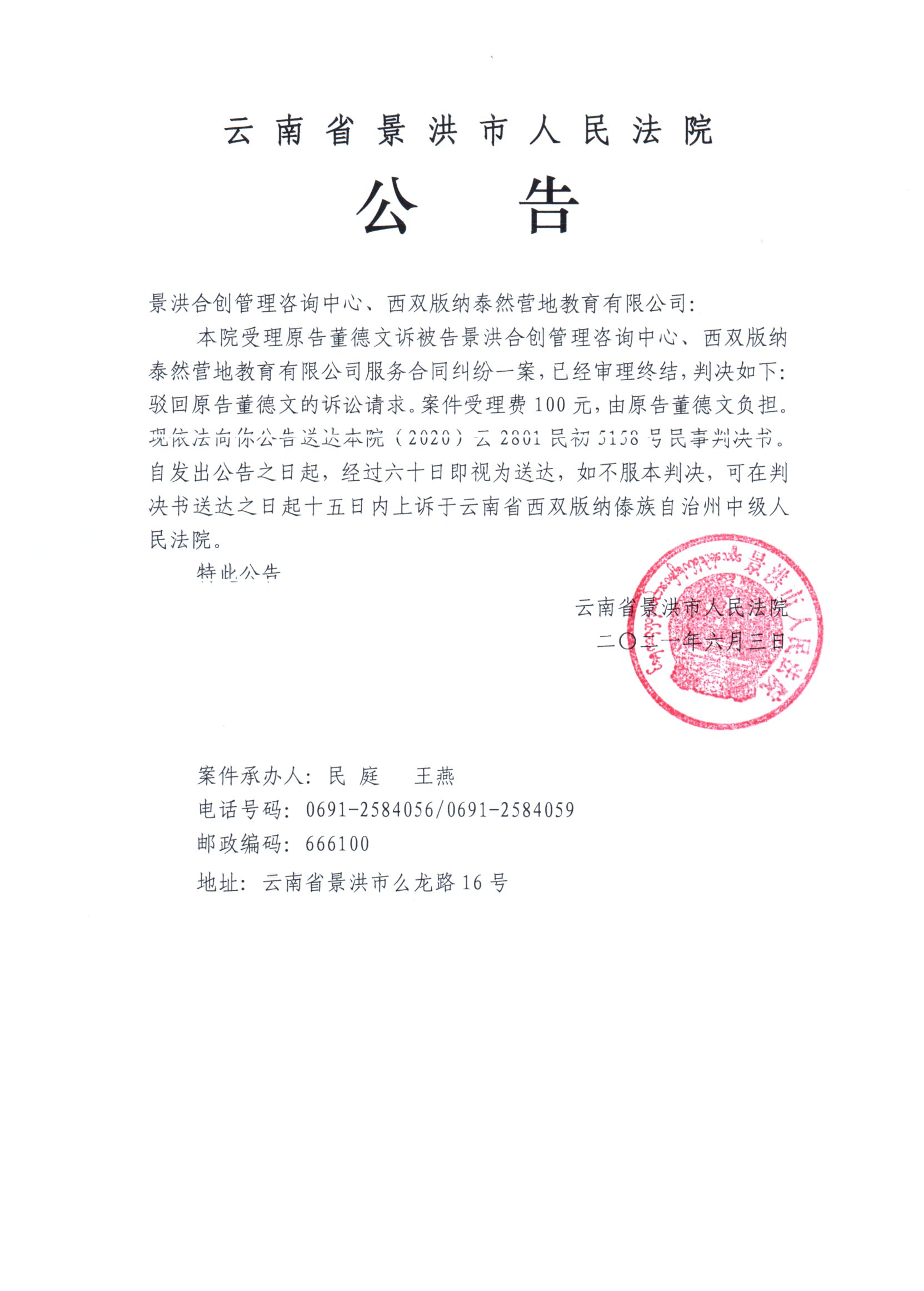 景洪合创管理咨询中心、西双版纳泰然营地教育有限公司(判决公告)