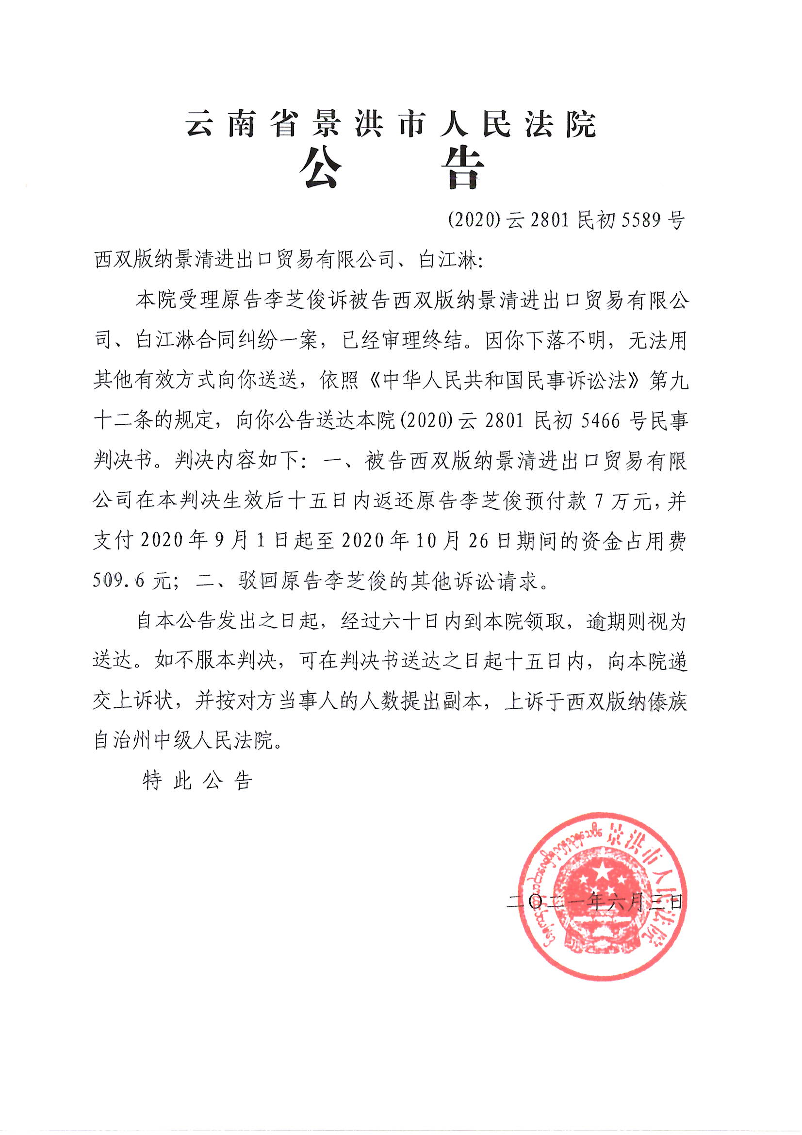 西双版纳景清进出口贸易有限公司、白江淋(判决公告)