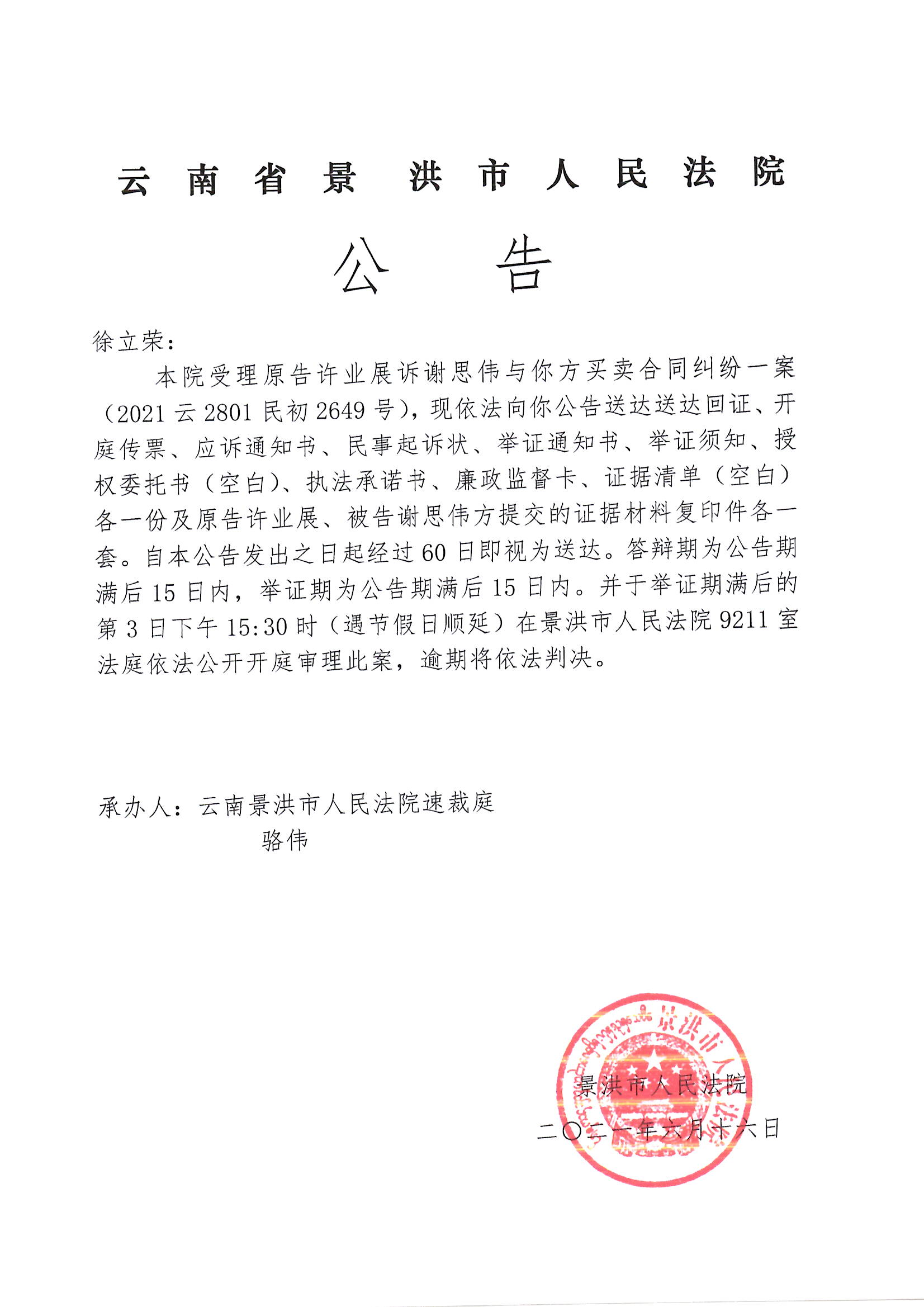 徐立荣(传票公告)