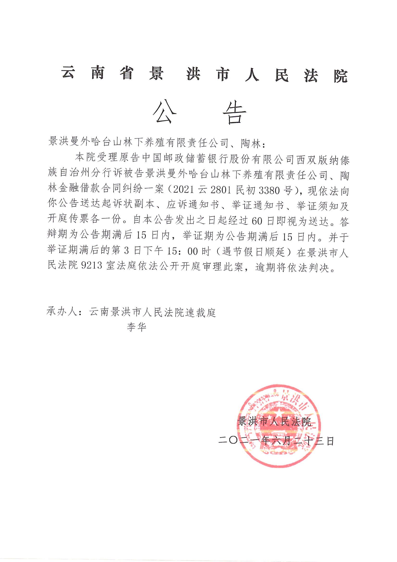 景洪曼外哈台山林下养殖有限责任公司、陶林