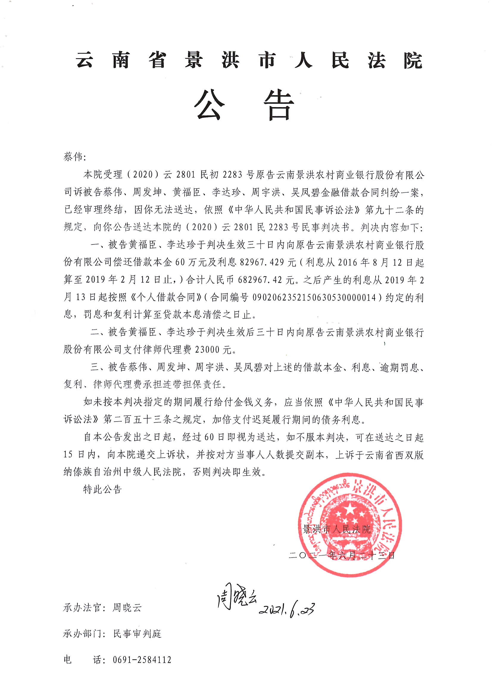 蔡伟(2020)云2801民初2283号判决公告