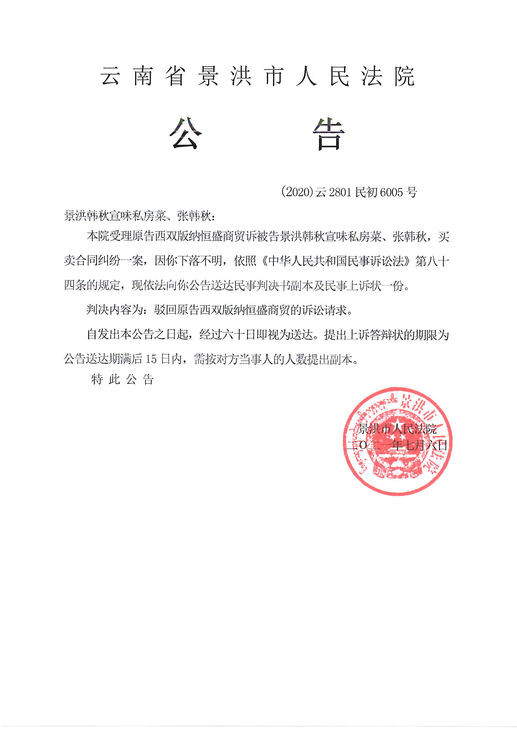 景洪韩秋宣味私房菜、张韩秋(判决、上诉状公告)