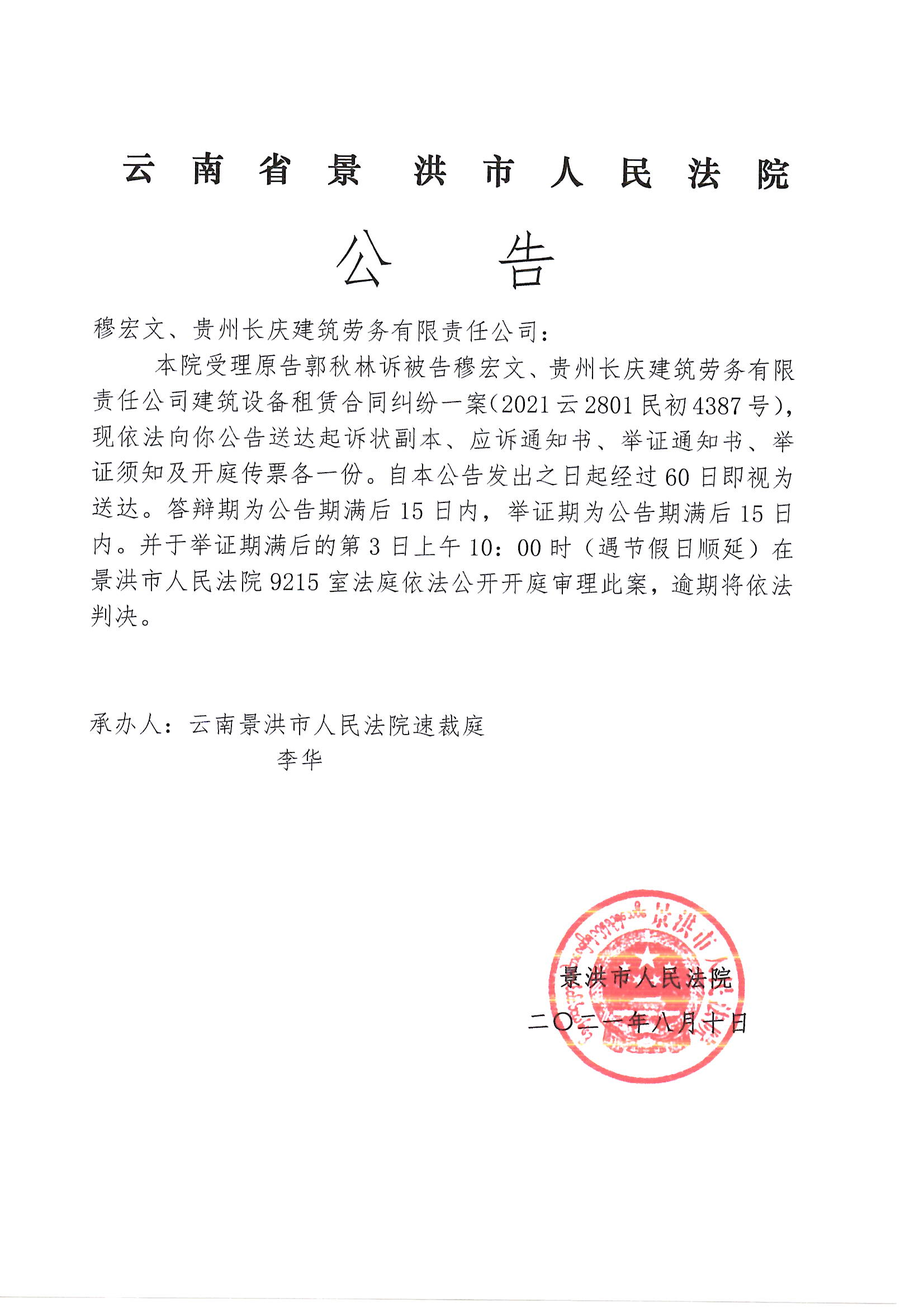 穆宏文、贵州长庆建筑劳务有限责任公司(传票公告)