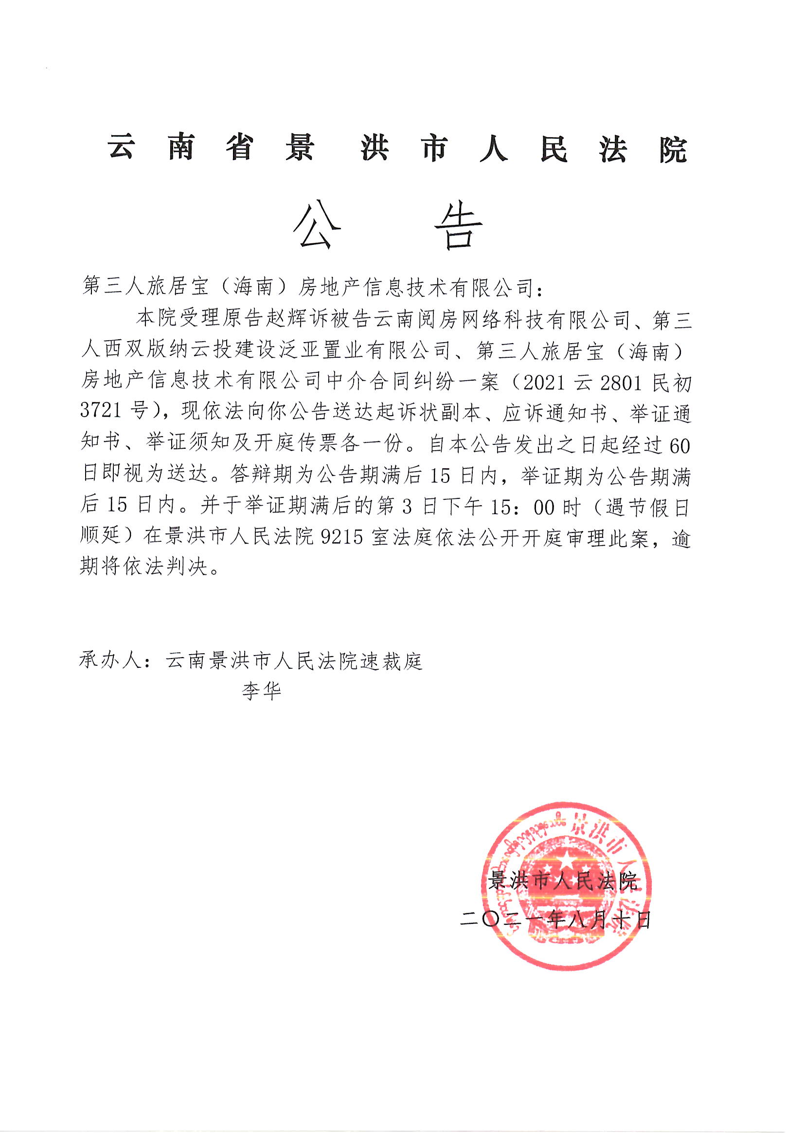 第三人旅居宝(海南)房地产信息技术有限公司(传票公告)