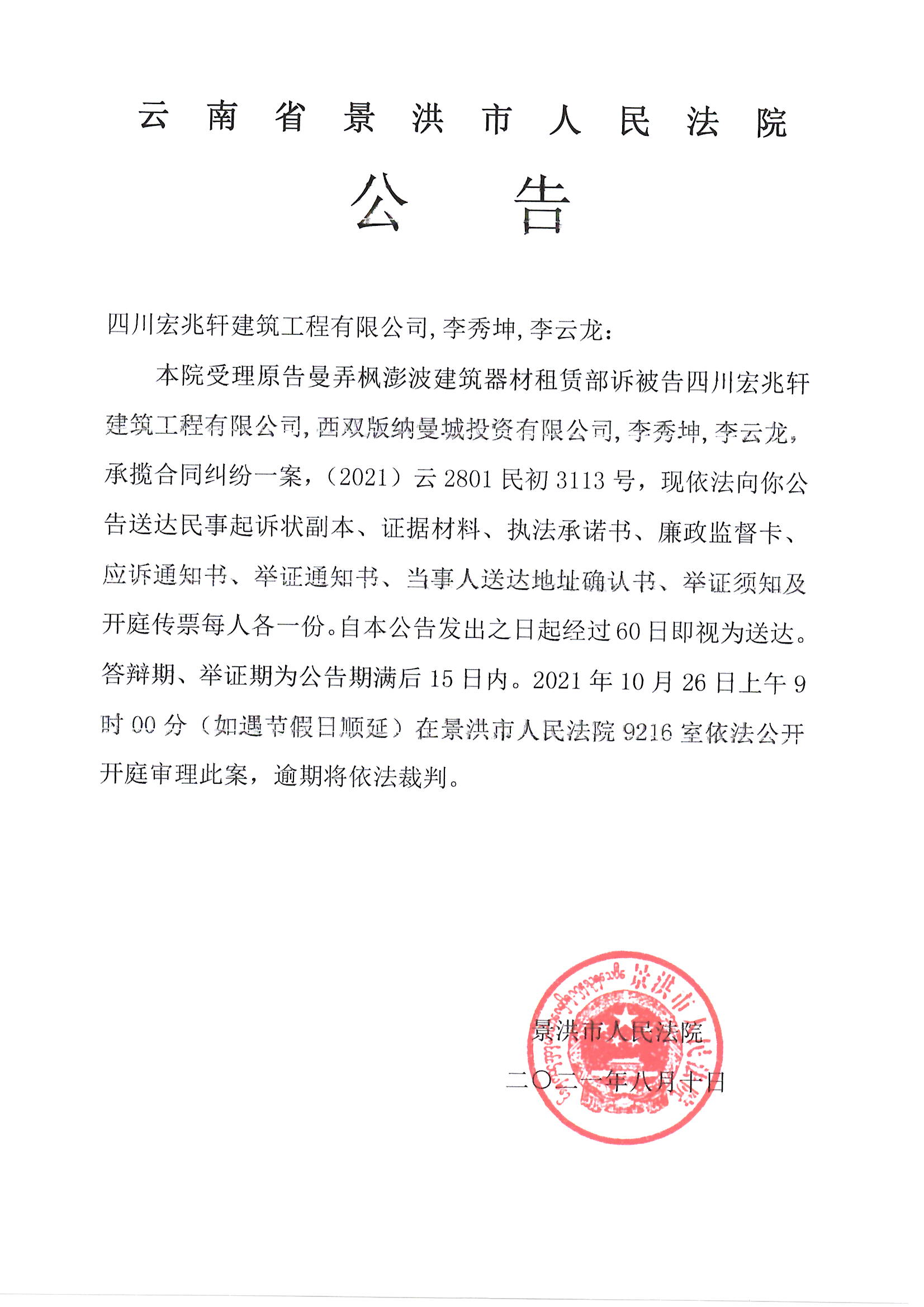 四川宏兆轩建筑工程有限公司、李秀坤、李云龙(开庭公告)