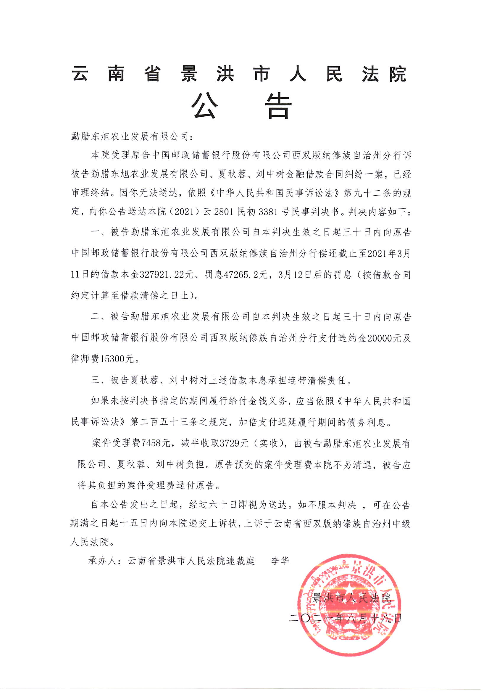 勐腊东旭农业发展有限公司(判决公告)