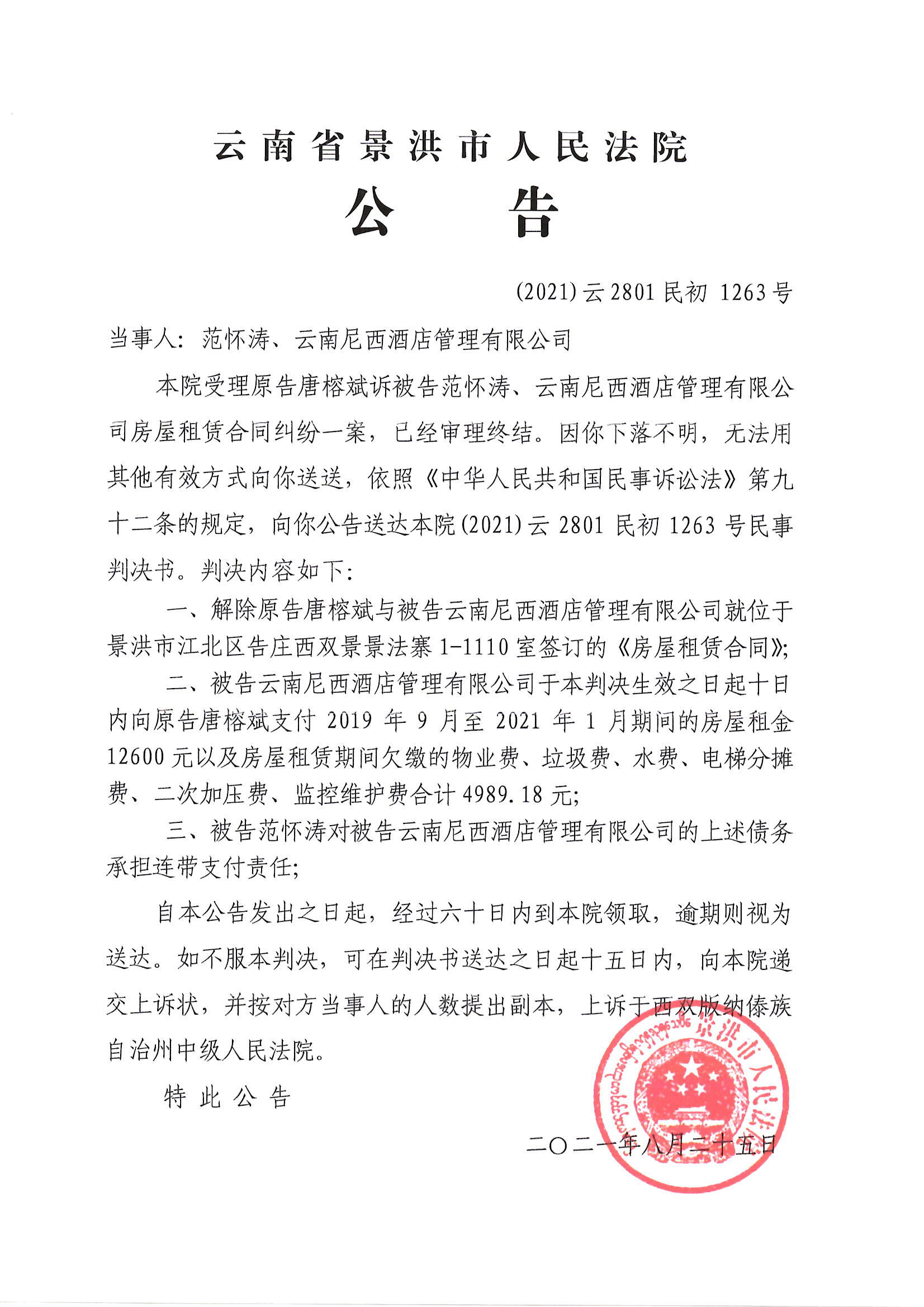 范怀涛、云南尼西酒店管理有限公司(判决)