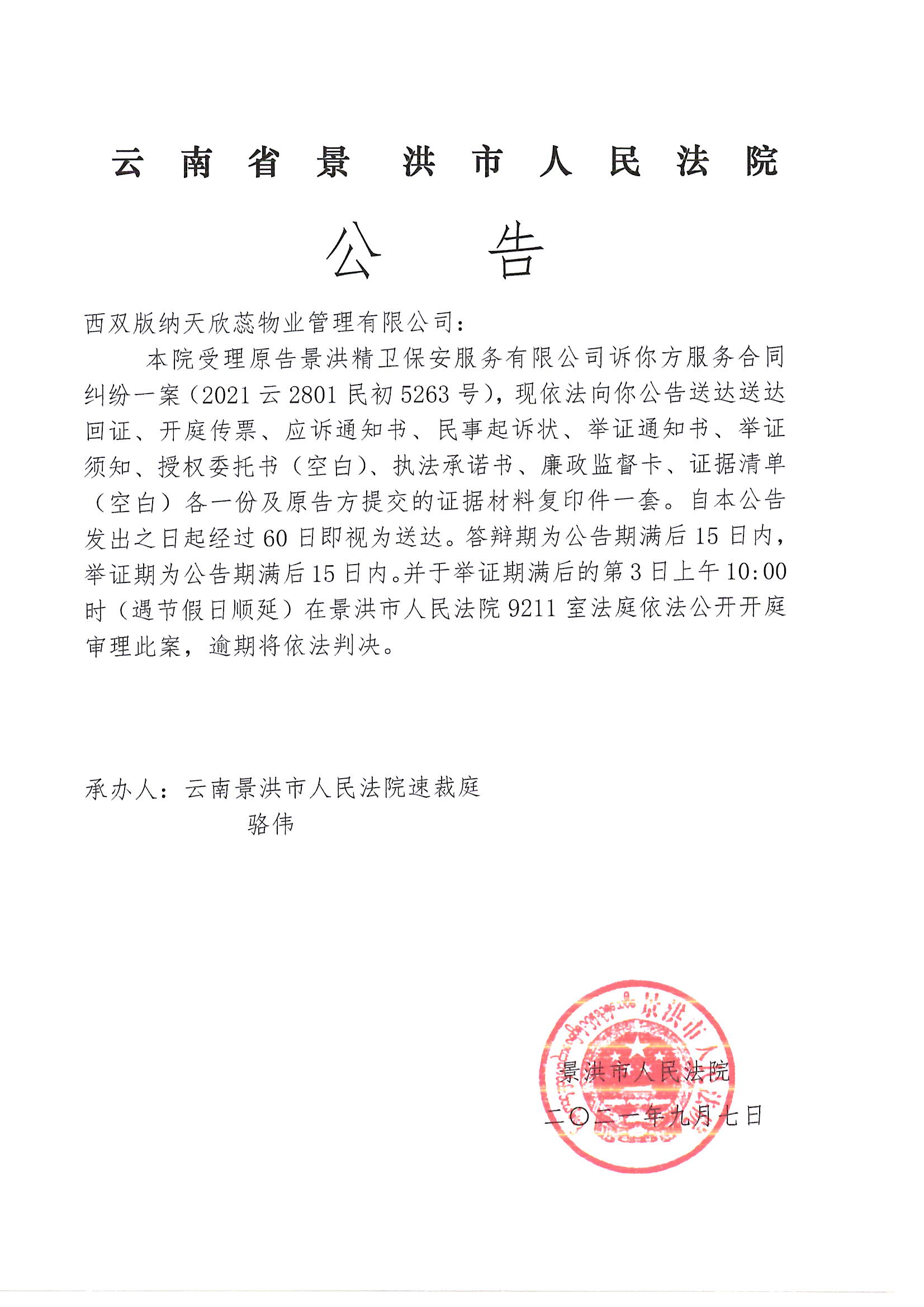 西双版纳天欣蕊物业管理有限公司(民初5263号传票公告)