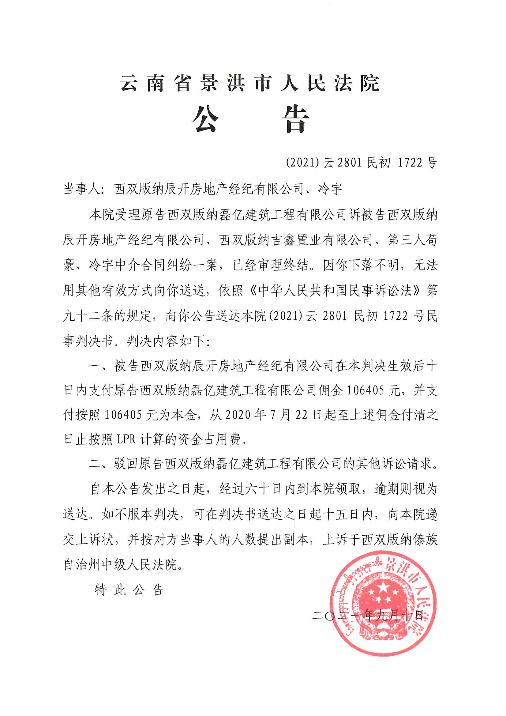 西双版纳辰开房地产经纪有限公司、冷宇(判决公告)