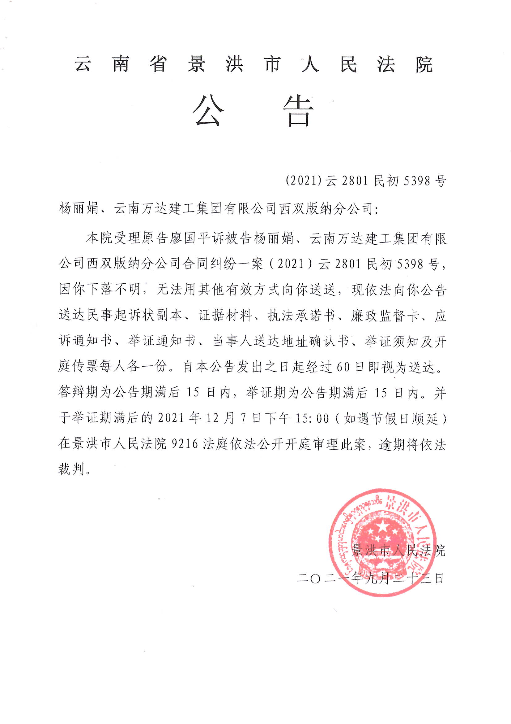 杨丽娟、云南万达建工集团有限公司西双版纳分公司(开庭公告)