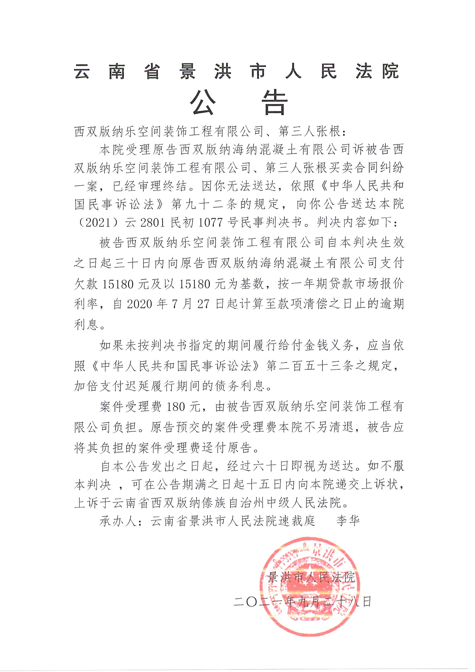 西双版纳乐空间装饰工程有限公司、第三人张根(判决公告)