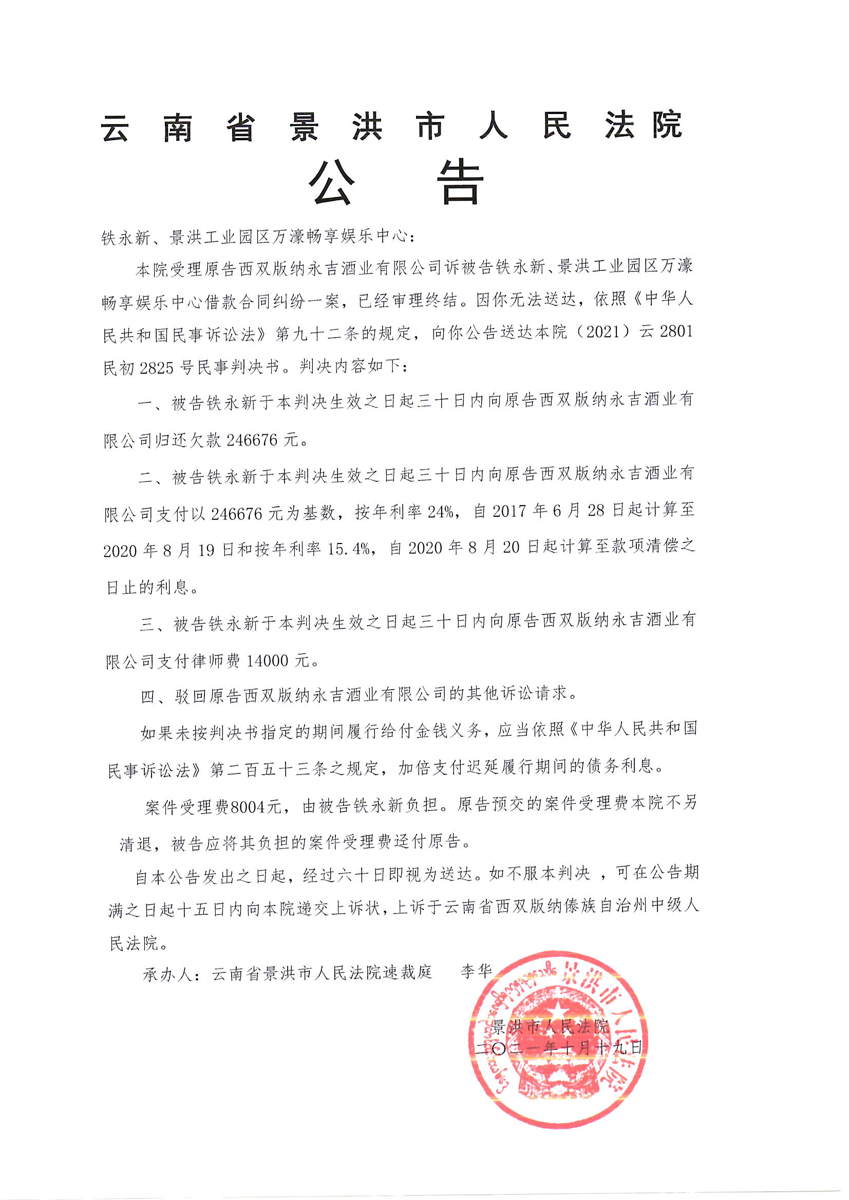 铁永新、景洪工业园区万濠畅享娱乐中心(判决公告)