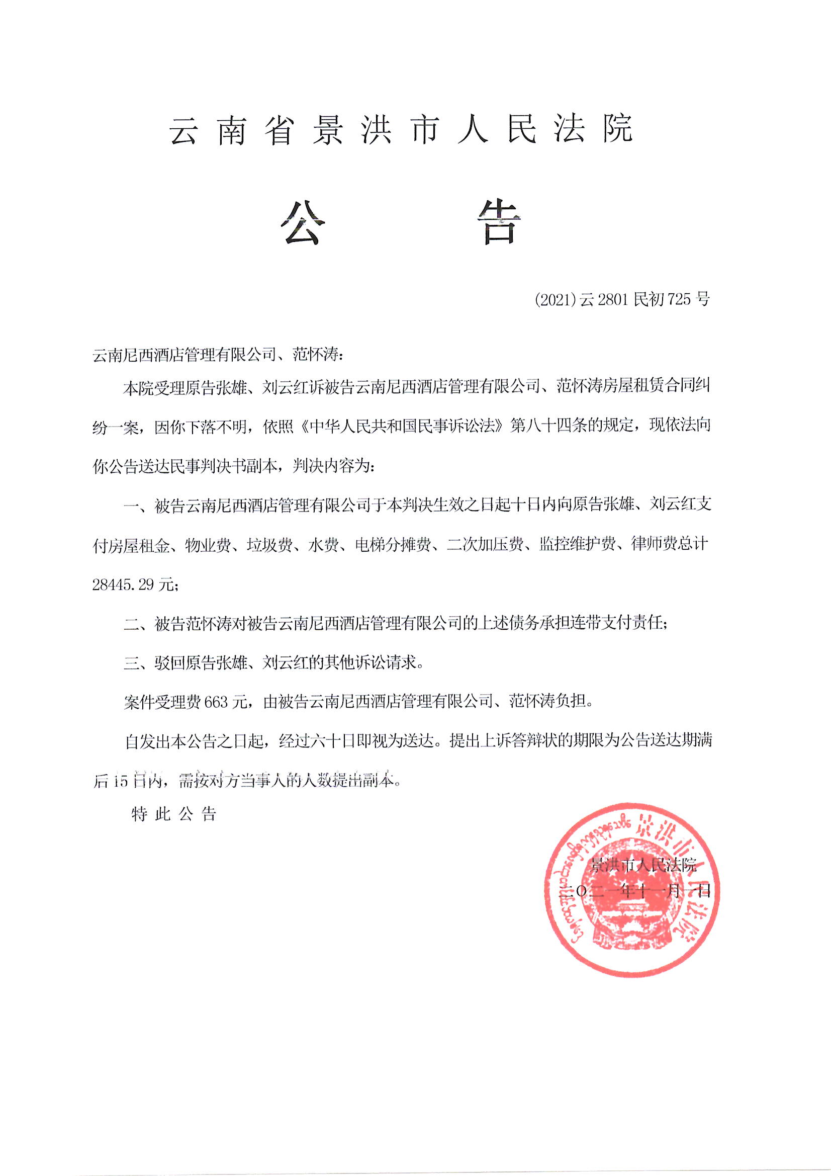 云南尼西酒店管理有限公司、范怀涛(判决公告)