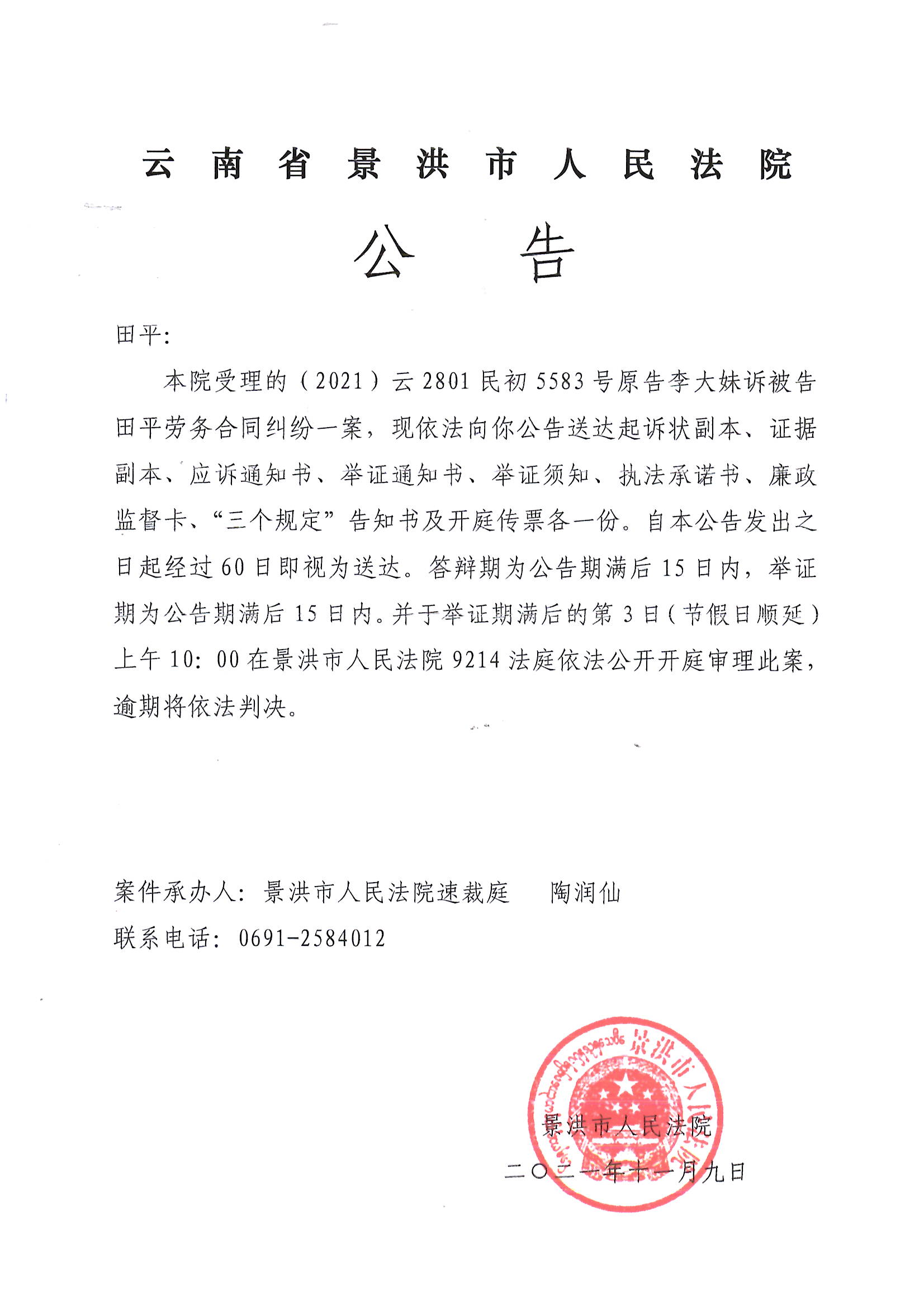 田平(传票公告)
