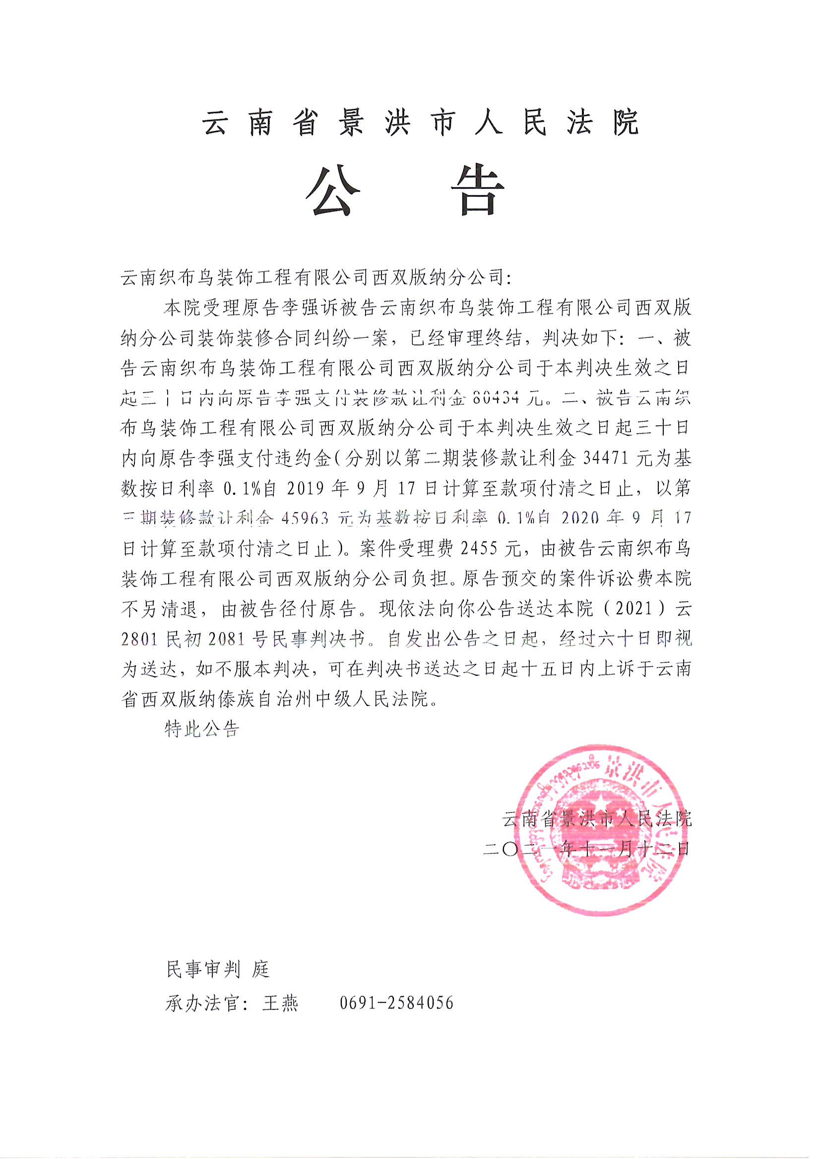 (2021)2081 云南织布鸟装饰工程有限公司西双版纳分公司 (判决公告)