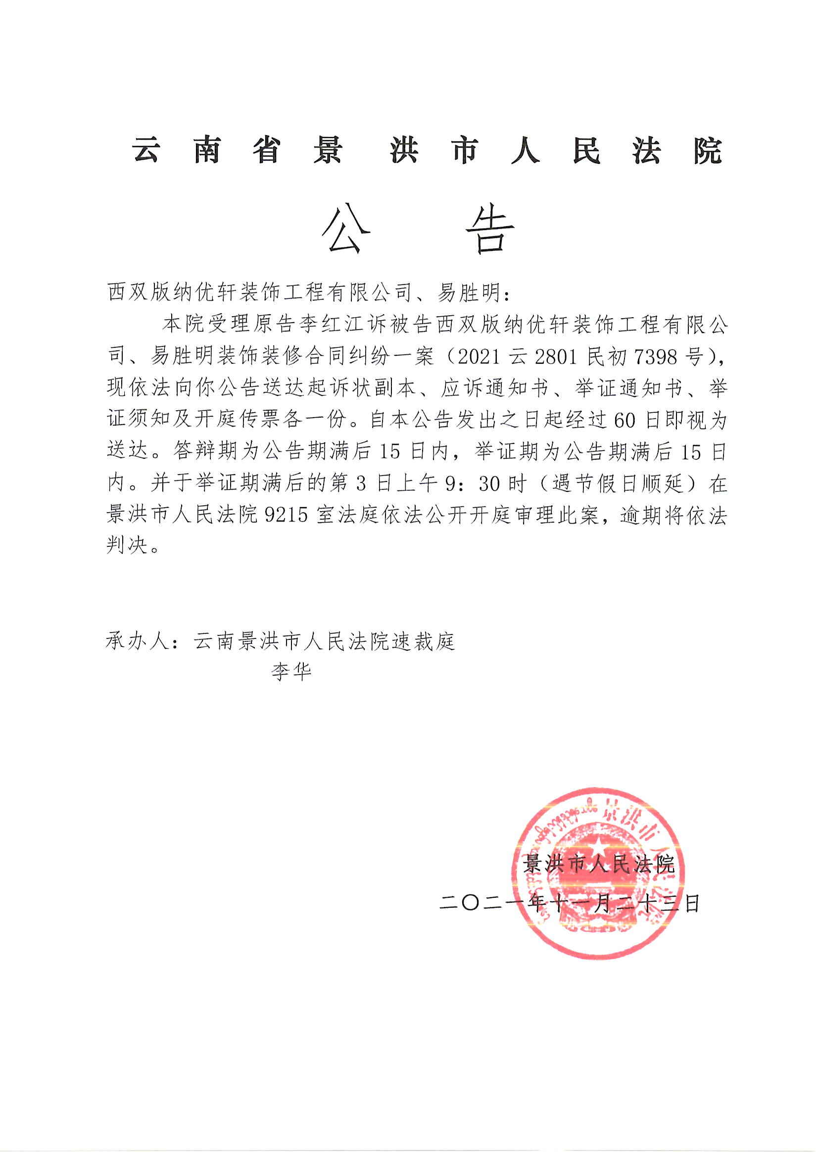 西双版纳优轩装饰工程有限公司、易胜明(传票公告)