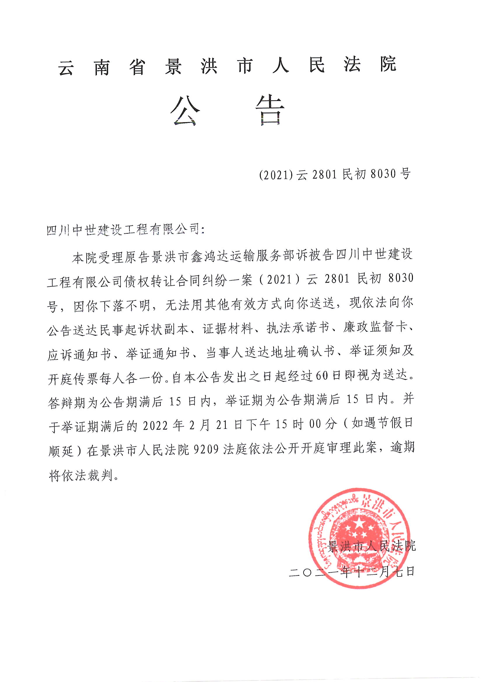 四川中世建设工程有限公司(开庭公告)