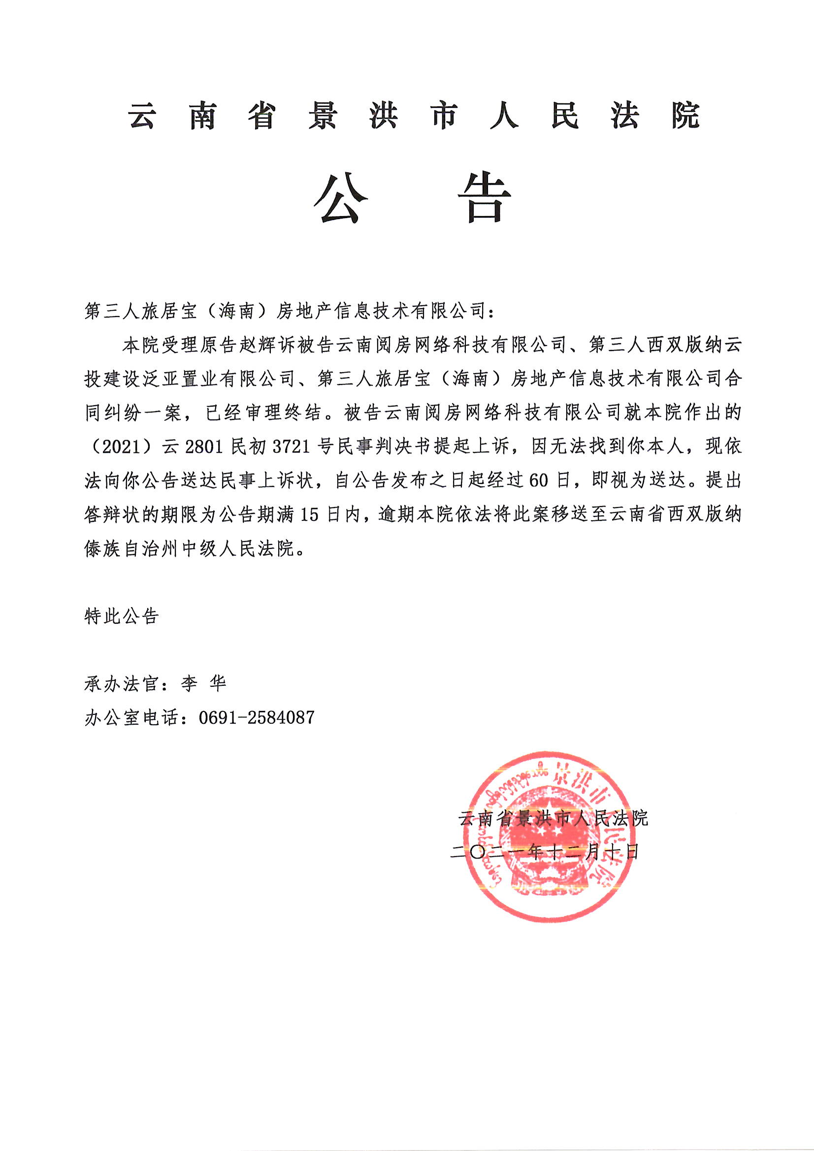 第三人旅居宝(海南)房地产信息技术有限公司(上诉状公告)