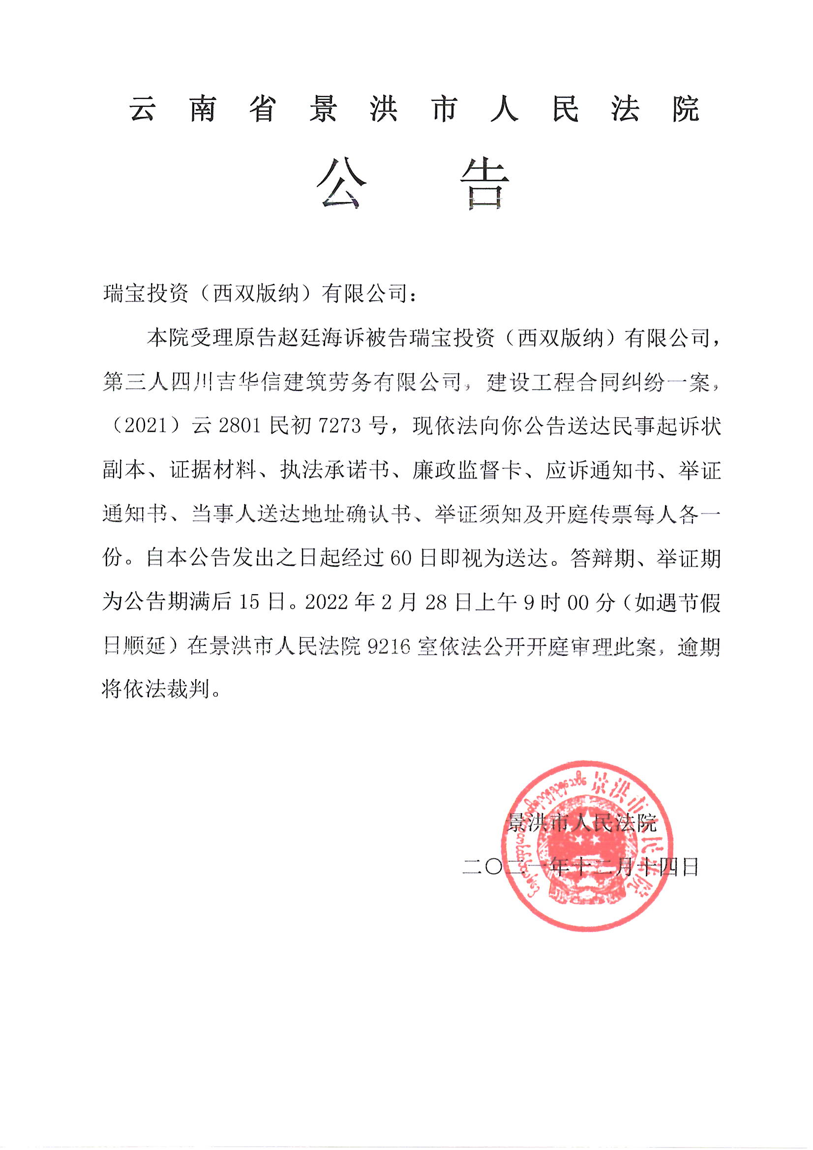 瑞宝投资(西双版纳)有限公司(开庭公告)