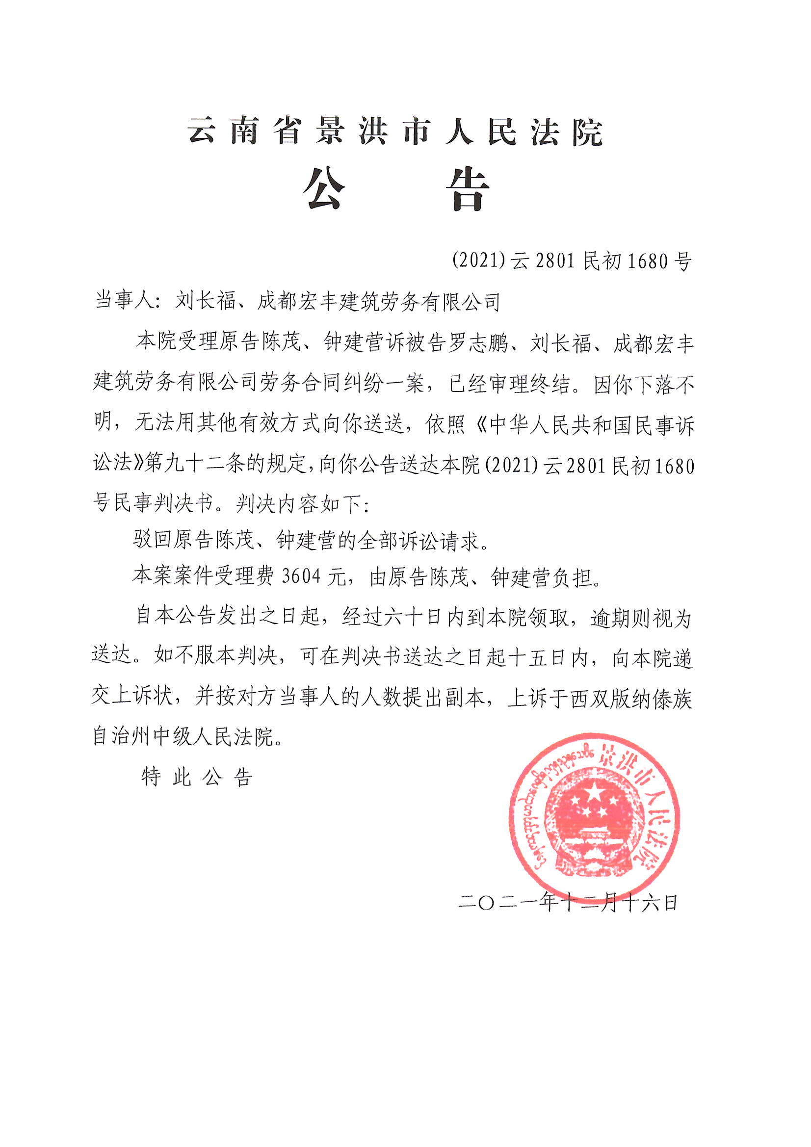 刘长福、成都宏丰建筑劳务有限公司(判决)