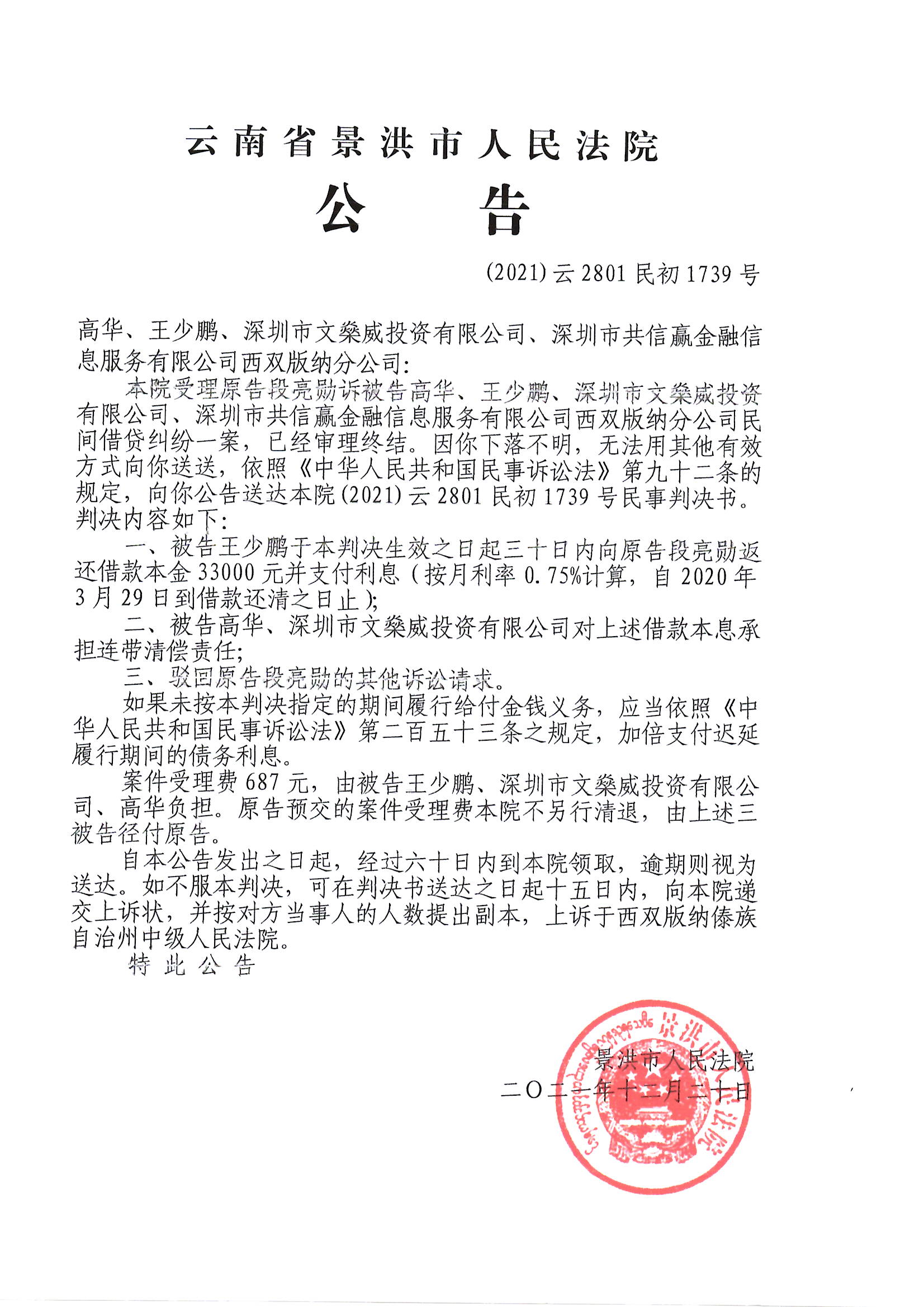 高华、王少鹏、深圳市文燊威投资有限公司、深圳市共信赢金融信息服务有限公司西双版纳分公司(判决公告)