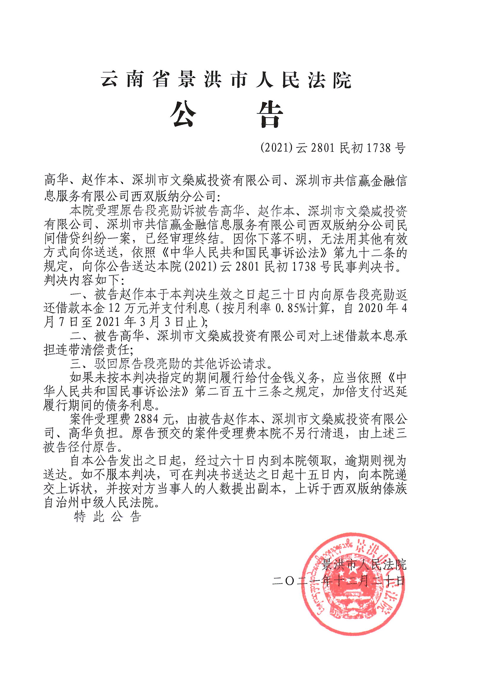 高华、赵作本、深圳市文燊威投资有限公司、深圳市共信赢金融信息服务有限公司西双版纳分公司(判决公告)