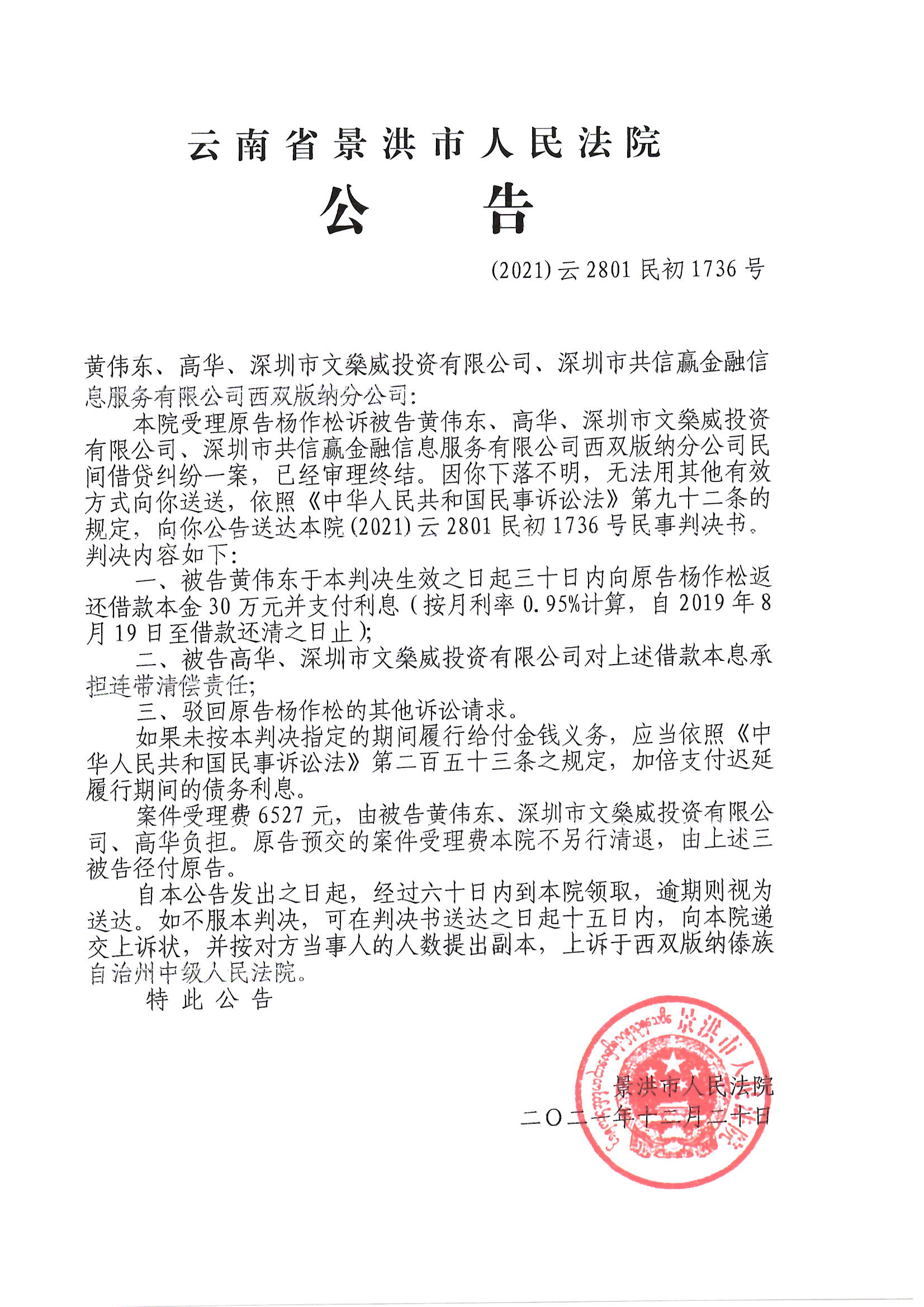 黄伟东、高华、深圳市文燊威投资有限公司、深圳市共信赢金融信息服务有限公司西双版纳分公司(判决公告)