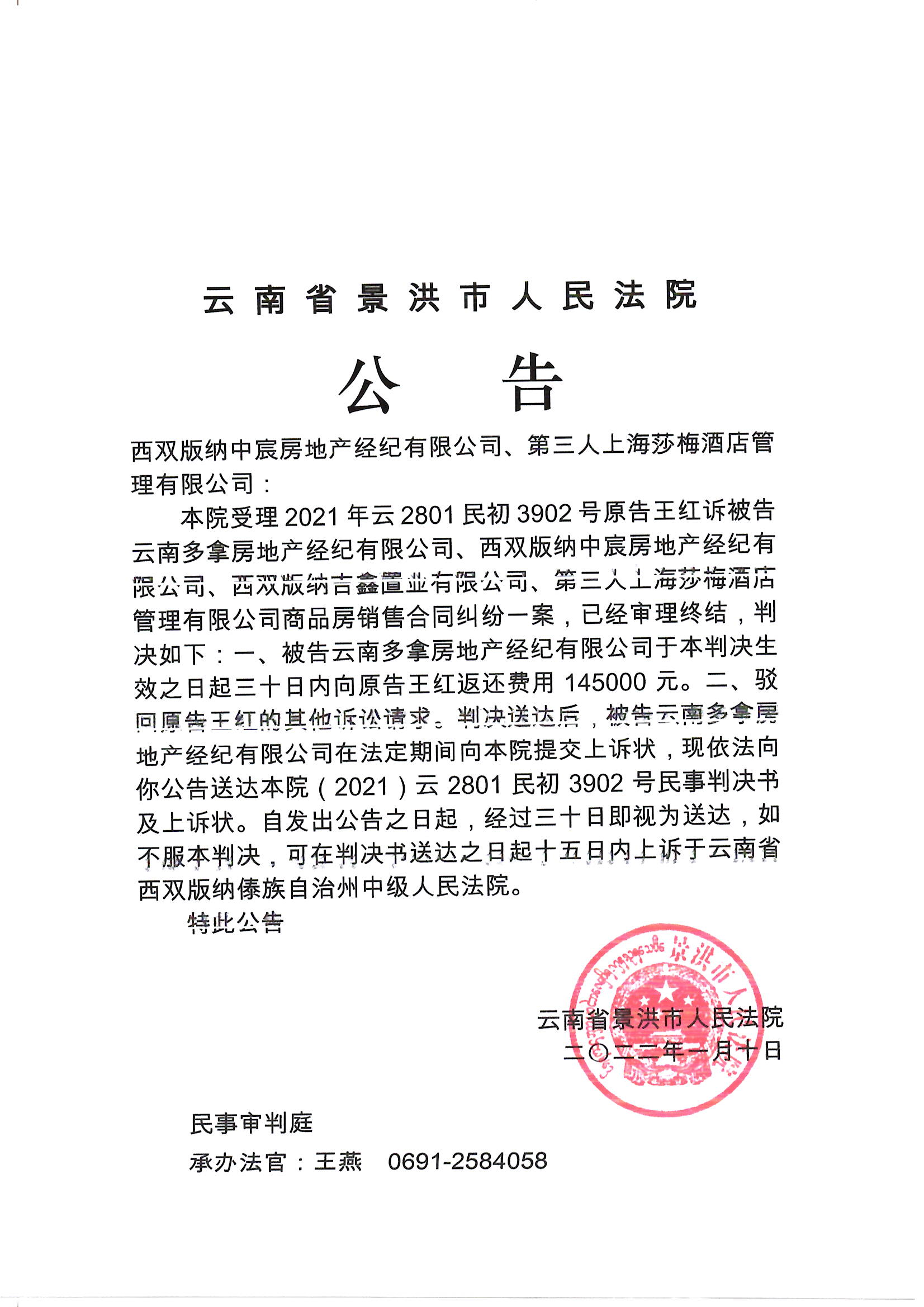 西双版纳中宸房地产经纪有限公司、第三人上海莎梅酒店管理有限公司判决、上诉状公告