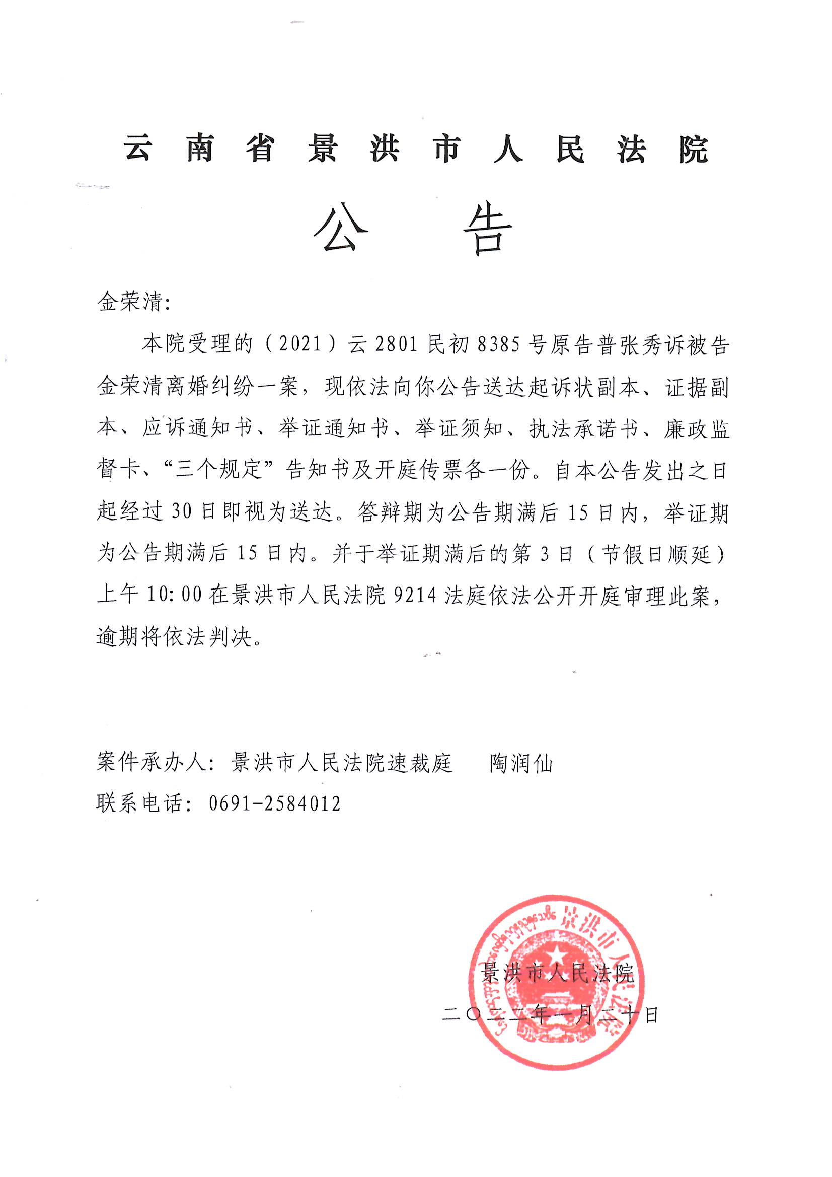 金荣清(传票公告)