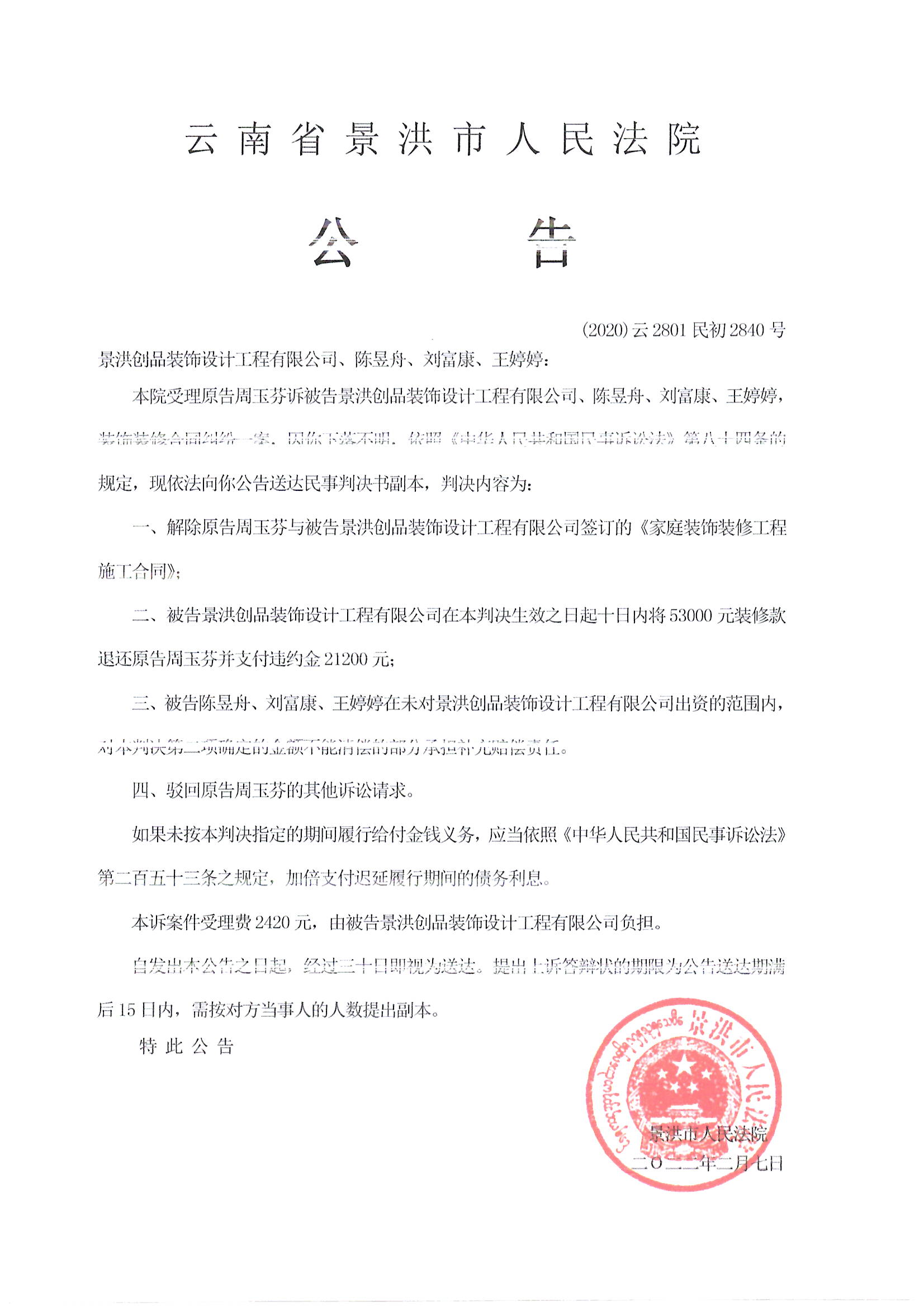 景洪创品装饰设计工程有限公司、陈昱舟、刘富康、王婷婷(判决公告)