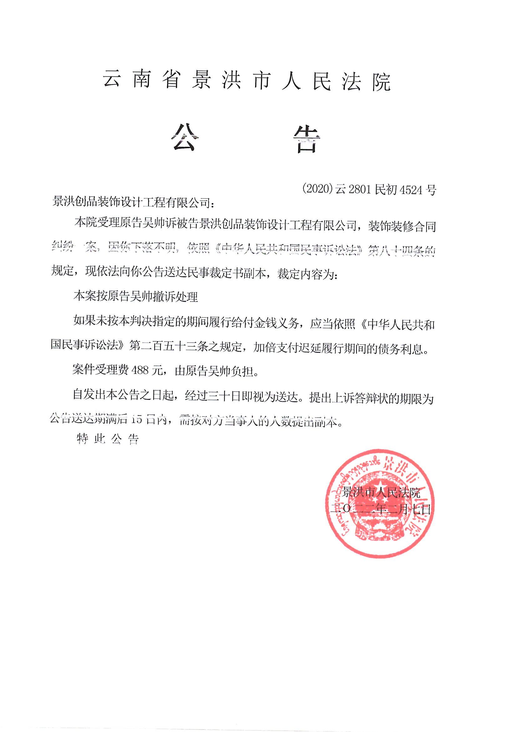 景洪创品装饰设计工程有限公司(判决公告)