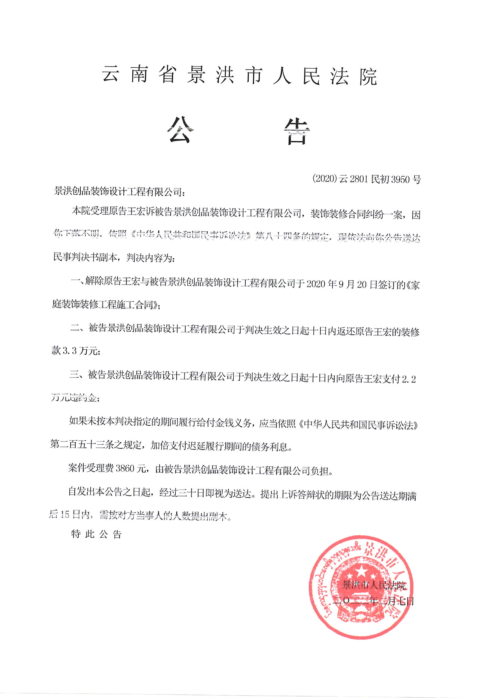 景洪创品装饰设计工程有限公司(3950判决公告)
